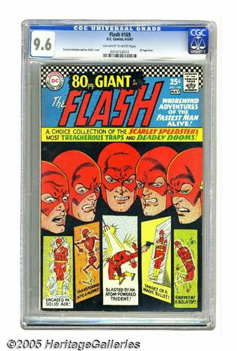 <B>The Flash #169 (DC, 1967) CGC NM+ 9.6 Off-white to white pages.</B></I> This square bound issue is also known as <B>80-Page Giant</B></I> G-34. These pages re-present Flash's battles with the Top, the Mirror Master, Gorilla Grodd, and others, all with Carmine Infantino art. The cover is also by Infantino. Overstreet 2005 NM- 9.2 value = $130. CGC census 5/05: 3 in 9.6, none higher.