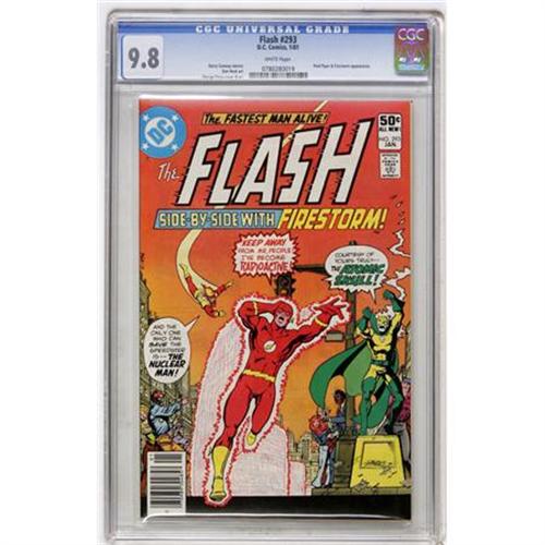 <B>The Flash #293 (DC, 1981) CGC NM/MT 9.8 White pages.</B></I> Piped Piper and Firestorm appearances. George Perez cover. Perez and Don Heck art. Tied with only one other copy of this issue for the highest CGC grade to date. Overstreet 2007 NM- 9.2 value = $5. CGC census 10/07: 3 in 9.8, none higher. <I> From the Fantastic Frank Collection.</B></I><BR><BR><b>Shipping:</b> Comics - Slabbed (certified) (<a target="_blank" href="http://www.heritageauctions.com/common/shipping.php">view shipping information</a>)
