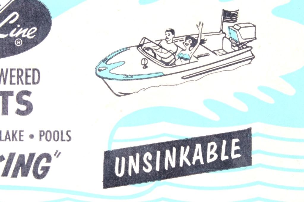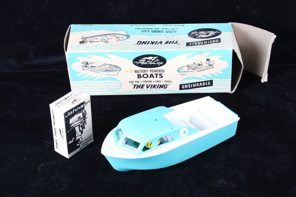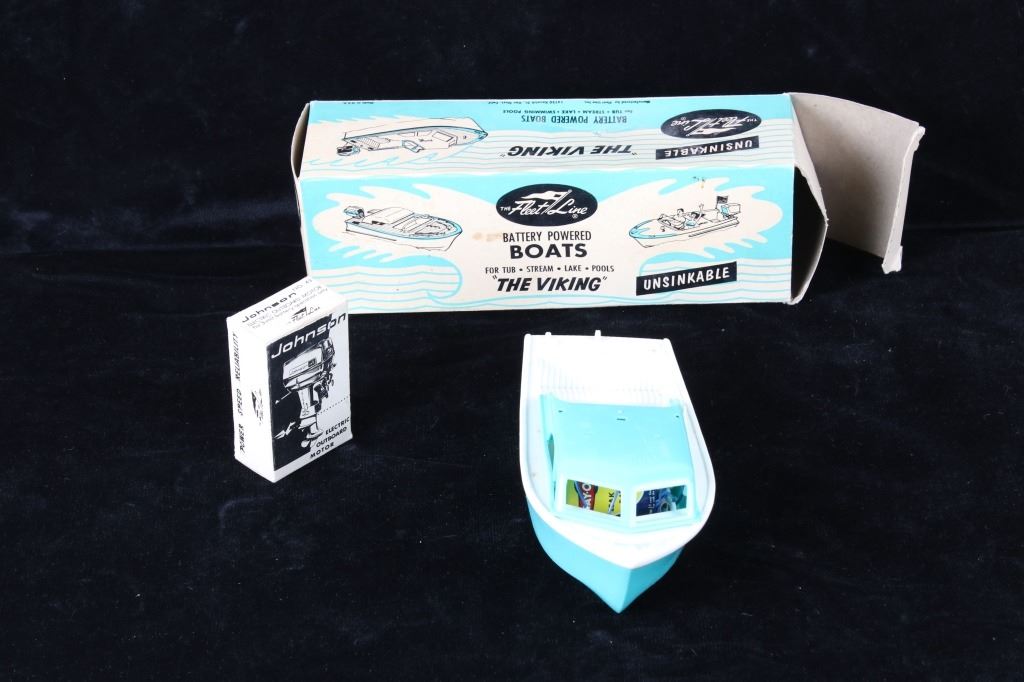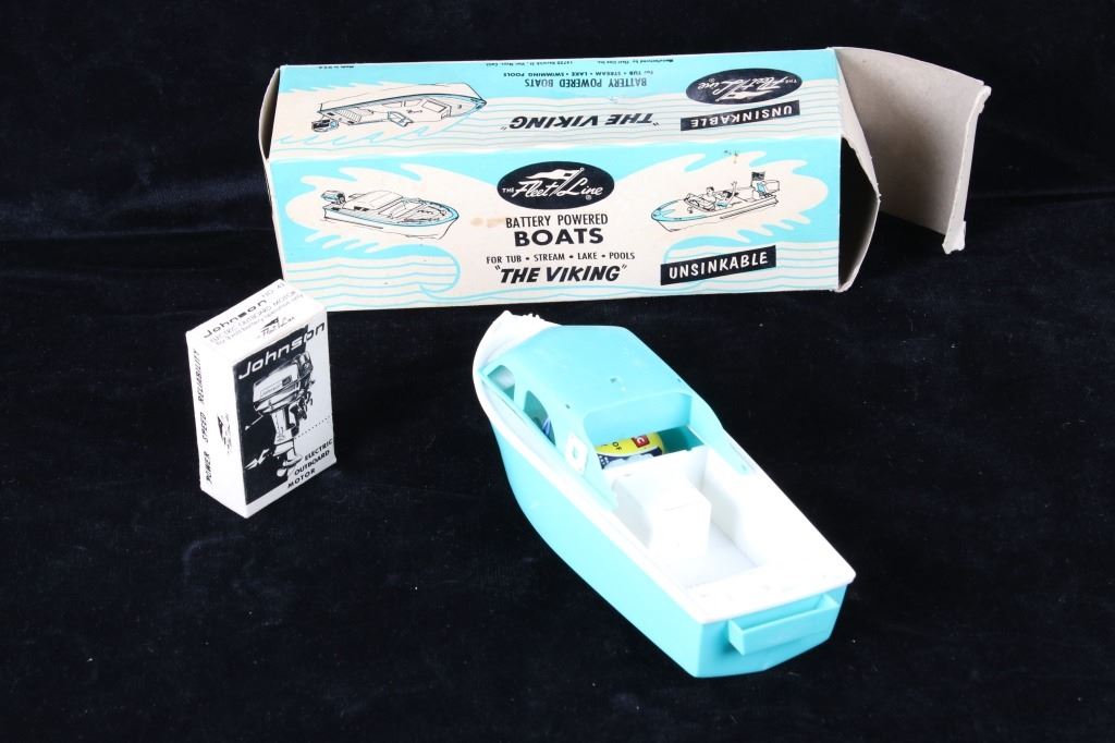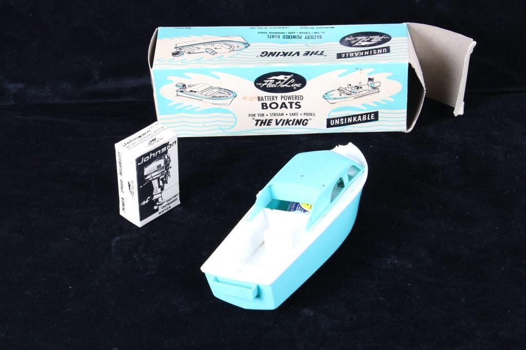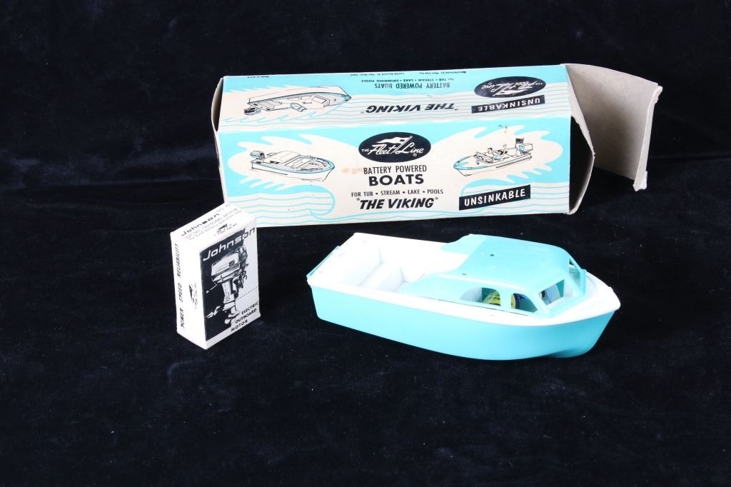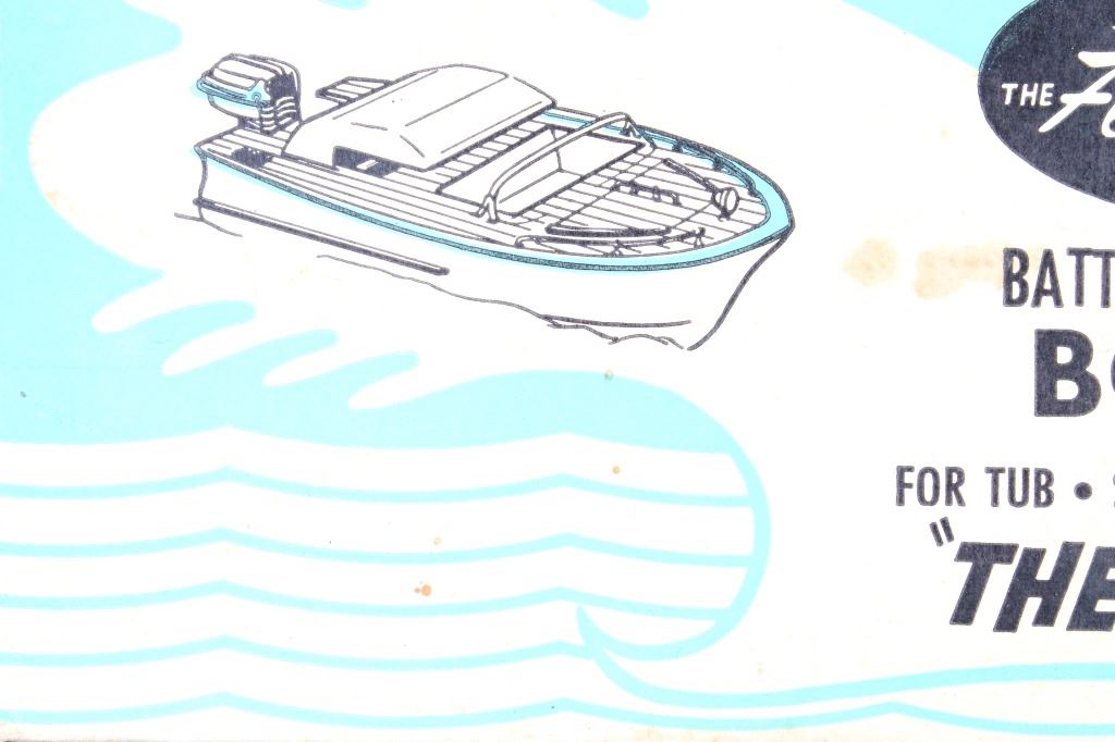 For your bidding pleasure is this The Fleet Line Battery Powered Boat "The Viking". The battery powered toy boat is for tub, stream, lake, and pools as the packaging says; the packaging which is original also claims the boat to be unsinkable. The measurements of the box are 3" x 11" x 4".