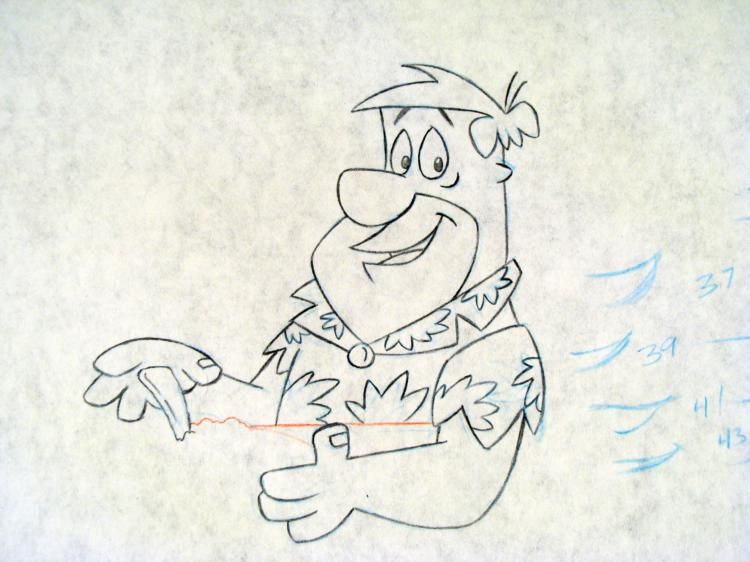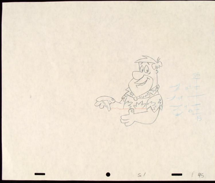 The show is set in the Stone Age town of Bedrock. (In some of the earlier episodes, it was also referred to as "Rockville"). The Flintstones was about a working-class Stone Age man's life with his family and his next-door neighbor and best friend. The show's * continuing popularity rested heavily on its juxtaposition of modern everyday concerns in the Stone Age setting. In this fantasy version of the past, dinosaurs, saber-toothed tigers, woolly mammoths, and other long-extinct animals co-exist with cavemen. Like * their mid-20th century peers, these cavemen listen to records, live in split-level homes, and eat out at restaurants, yet their technology is made entirely from pre-industrial materials and largely powered through the use of various animals. For example, the * cars are made out of stone, wood, and animal skins, and powered by the passengers' feet. * * * Get out of town!! No way... * * * * * Original "rough" animation drawing, in non-photo blue and black pencil with the notations in non-photo blue and black * * Overall size is a 12-field drawing that is 10 1/2" × 12 1/2" * Excellent condition * Traditional animation is a multi-step process which includes various types of art techniques. Drawings are a key part of the process, in which the animator creates the design and movement of the characters. Drawings are then transferred onto acetate cels * (by hand-inking and/or photo copying) to create a production cel, which is then hand painted on the back side, using paint colors chosen and approved by the creator of the series. * * * The drawing is ready to be matted and framed. The animator's notations are shown at the bottom and middle of the drawing.
