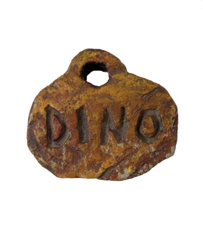 From the hit family favorite feature film, The Flintstones (1994) is Dino's screen used brown rubber 'Dino' dog tag. This comes directly from a team of the production and measures approximately 5" x 4 1/2".