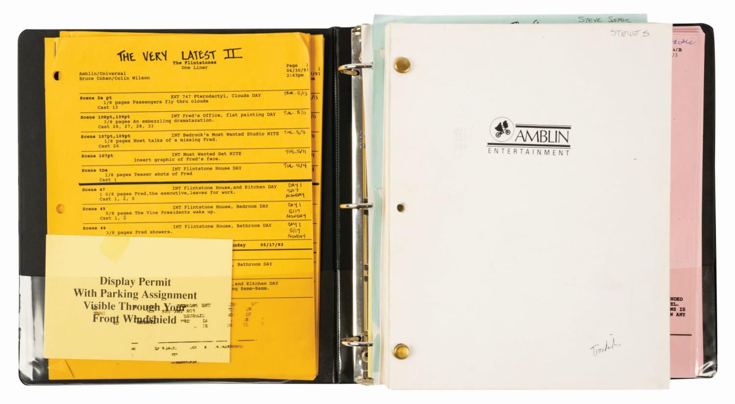 (Amblin, 1993) A binder of production notes relating to the production of Amblin Entertainment's The Flintstones. Included is a first draft, three shooting drafts, a production rendering of Slate & Co. and map to the shooting location. Measuring 11.5"x10.5" and 2.5" wide the binder and contents are in very good condition, Exhibiting some creases, folds, and wear to the edges and corners.