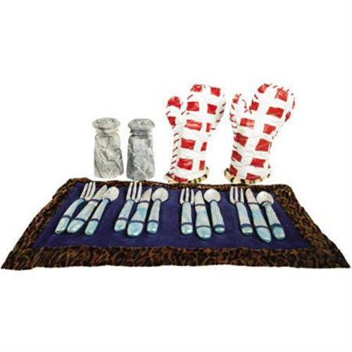 <B>"The Flintstones" Prop Flatware and Other Items.</B></I> Four sets of the Flintstones' flatware, featuring Dino-sized forks, knives and spoons (11") with a baby blue pearl finish presented in its blue suede and animal print carrying role (17" x 24"). Also a pair of salt and pepper shakers in massive Flintstone proportions (8") fashioned out of gray "granite" (dense foam) and a pair of jumbo red and white checkered cooking mitts with faux fur trim. Acquired from Universal Studios following production of the 1994 film <I>The Flintstones</B></I> <I>Authenticated by the world's foremost curators of television artifacts, The Comisar Collection of Beverly Hills.</B></I><BR><BR><b>Shipping:</b> Clothing, Costumes & Jerseys (<a target="_blank" href="http://www.heritageauctions.com/common/shipping.php">view shipping information</a>)