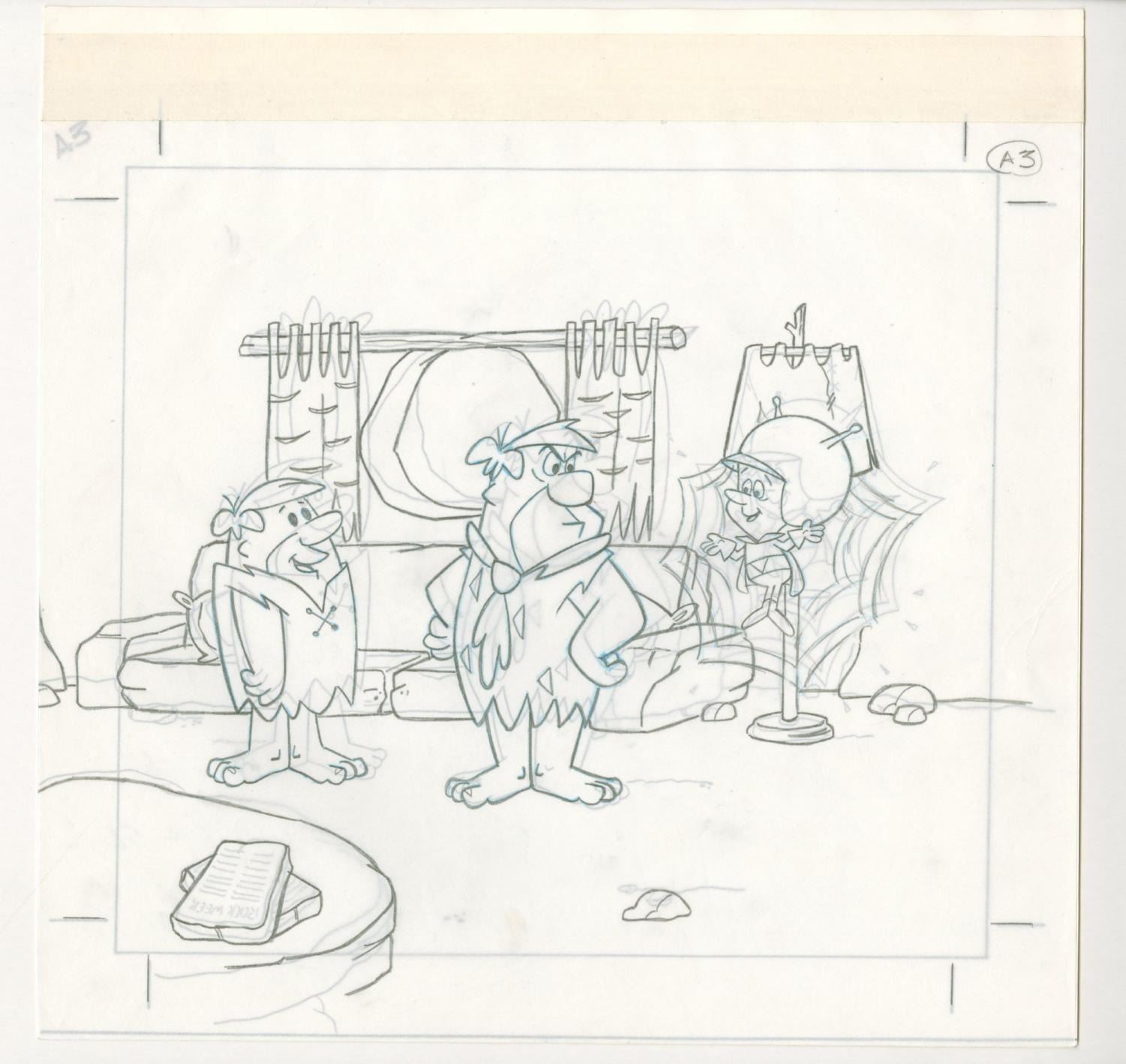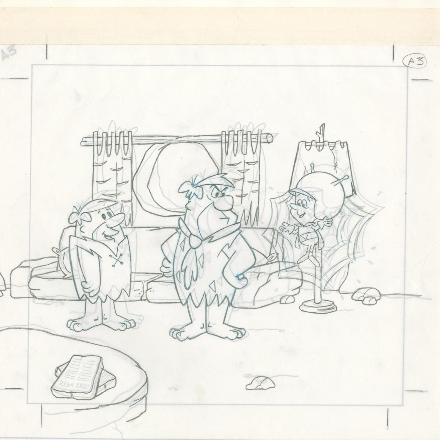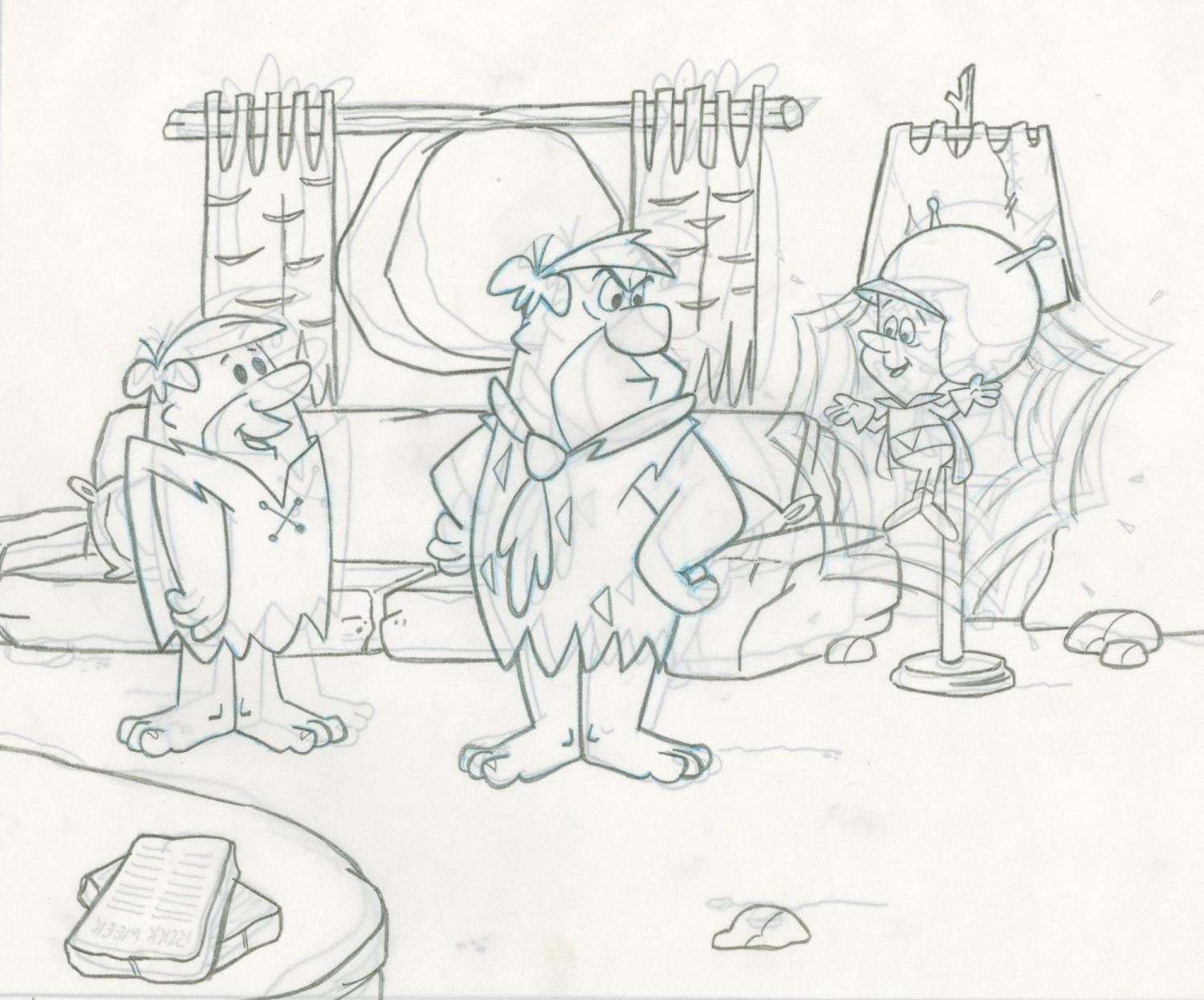 (Hanna-Barbera, 1990s) An original development drawing and a photocopy for a View-Master slide of "The Flintstones." The graphite drawing and photocopy were created at the studio and used to create a color image on a View-Master reel. Ranging in size from 11" x 12" , the development artwork is in very good condition with slight creasing and handling wear. Both pieces are taped onto thick card stock.