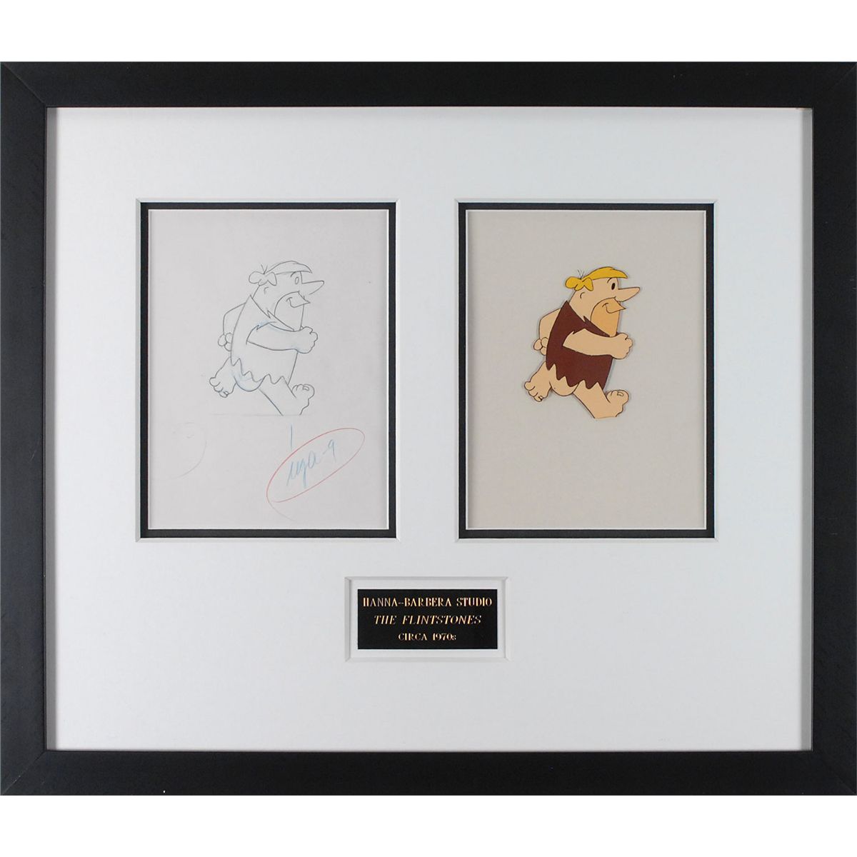 Original hand-painted animation cel of Barney Rubble from The Flintstones on a 5.75 x 7.75 sheet of acetate, together with the matching original pencil production sketch on an off-white 5.75 x 7.75 sheet. Attractively double-matted and framed with a descriptive plaque to an overall size of 21.5 x 18.5. In overall fine condition.