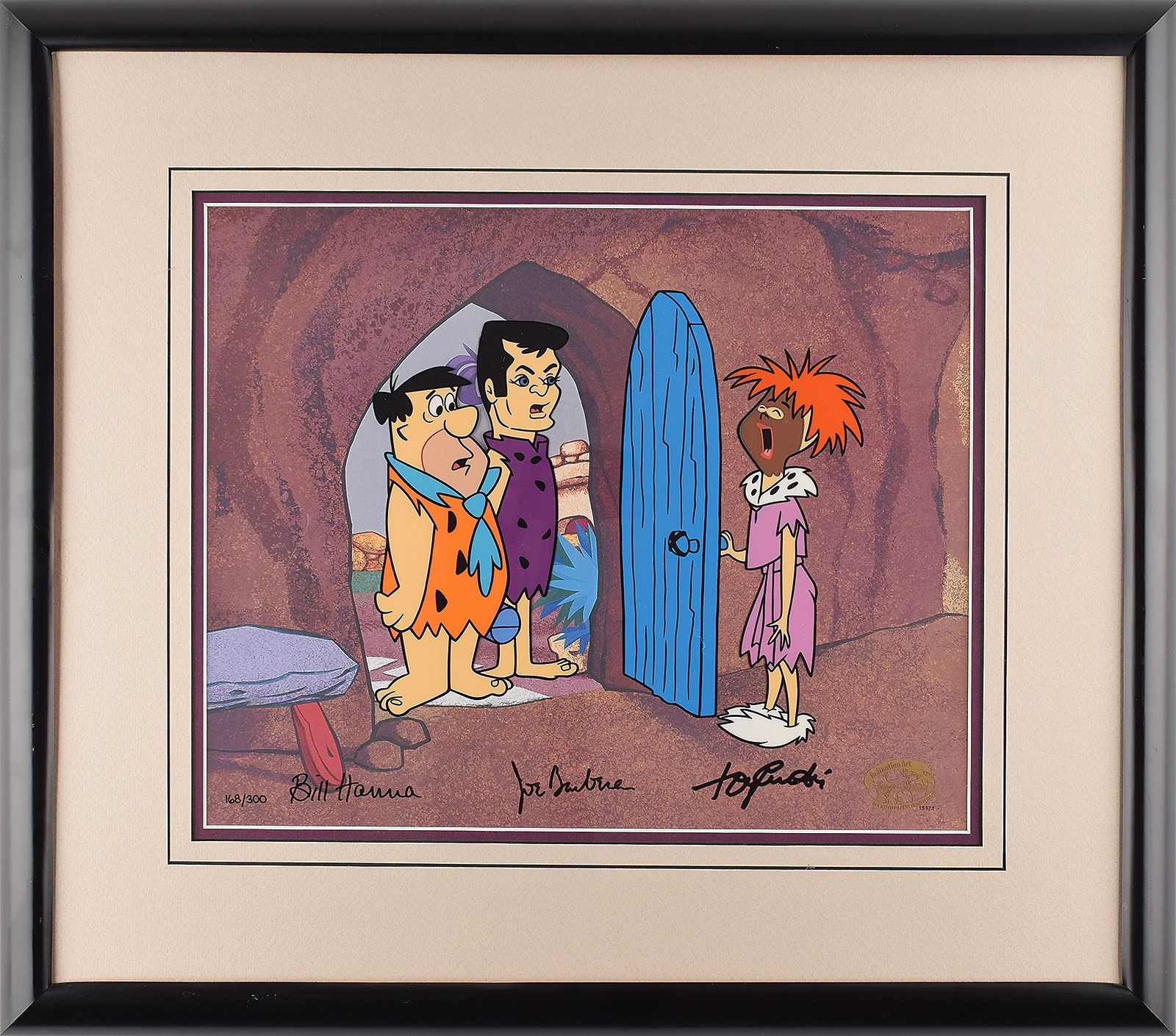 (Hanna-Barbera Studios, 1996) Limited edition hand-painted cel entitled 'The Return of Stony Curtis,' numbered 168/300, 16 x 13, depicting actor Tony Curtis in a 1965 episode of The Flintstones. Signed at the bottom in black felt tip by Bill Hanna, Joe Barbera, and Tony Curtis. Double-matted and framed to an overall size of 25 x 22. Cel bears a Hanna-Barbera seal to lower right. In fine condition. Accompanied by a certificate of authenticity from Hanna-Barbera, signed in black felt tip, "Best wishes, Joe Barbera."
