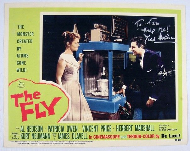 The Fly (1958) Lobby Card Signed By David Hedison - One of the most brilliantly conceived horror films of all time is the cult classic "The Fly" (1958) in which scientist Andre Delambre (David Hedison, called "Al" Hedison in this movie), is working on his new invention, a teleporter (long before Star Trek perfected it), and while testing it, finds a fly has found itself into his chamber, so that when his "atoms" are reconstructed on the other side, he has both his own and the fly's "atoms" mixed together with horrific results! His final cry of "Help Me!", has been voted one of the ten most famous closing lines in movie history, and the most haunting of them all. This is a beautiful original oversize color theatrical lobby card from the original 1958 release, made that much more desirable with an autograph by David Hedison. He has included along with his signature, in his own handwriting, the infamous line: "Help Me!". 14"x11".