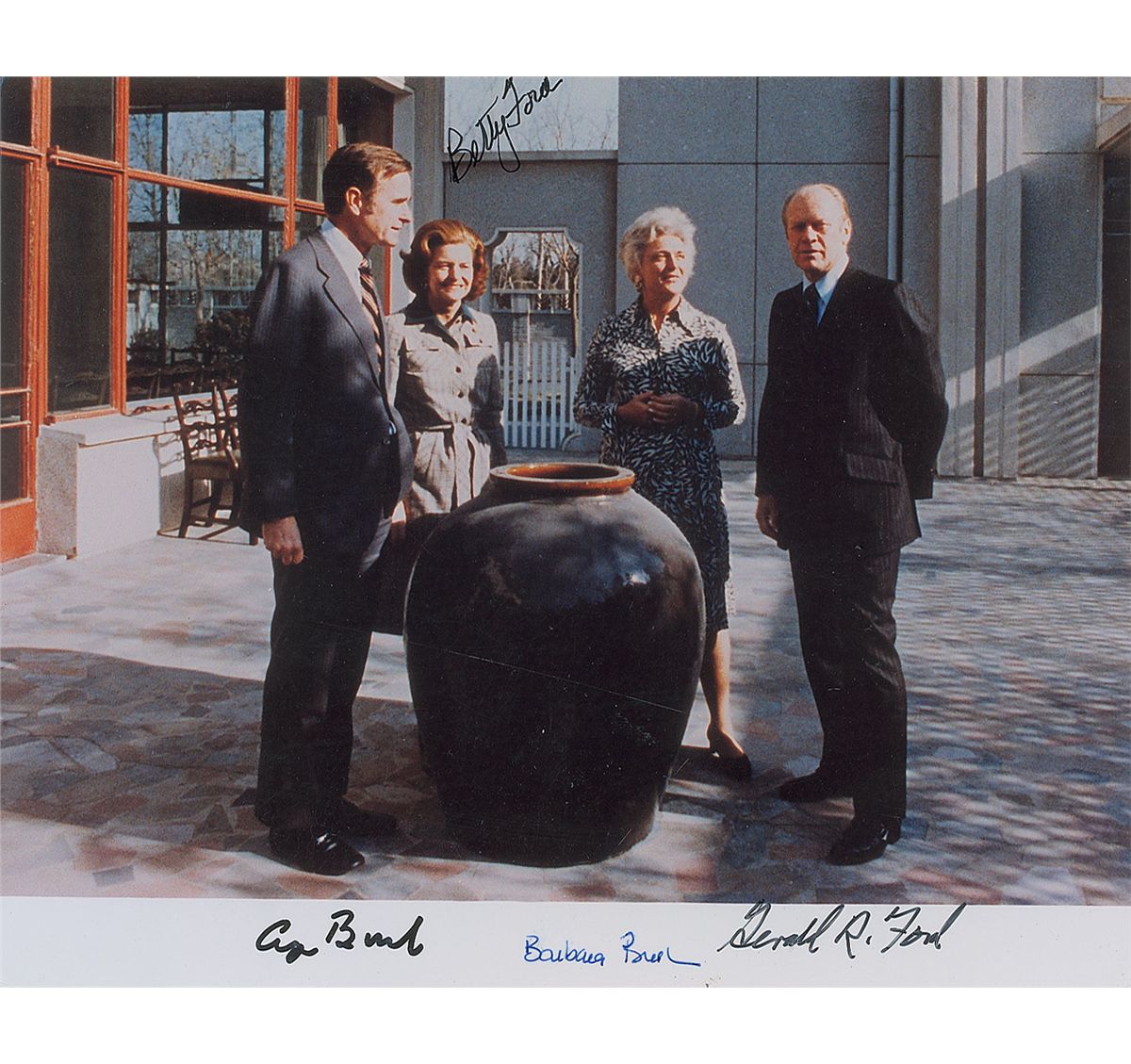 Color glossy 10 x 8 photo of the Fords and Bushes together in a courtyard, signed in black felt tip by Gerald Ford, George Bush, and Betty Ford and signed in blue felt tip by Barbara Bush. In fine condition.