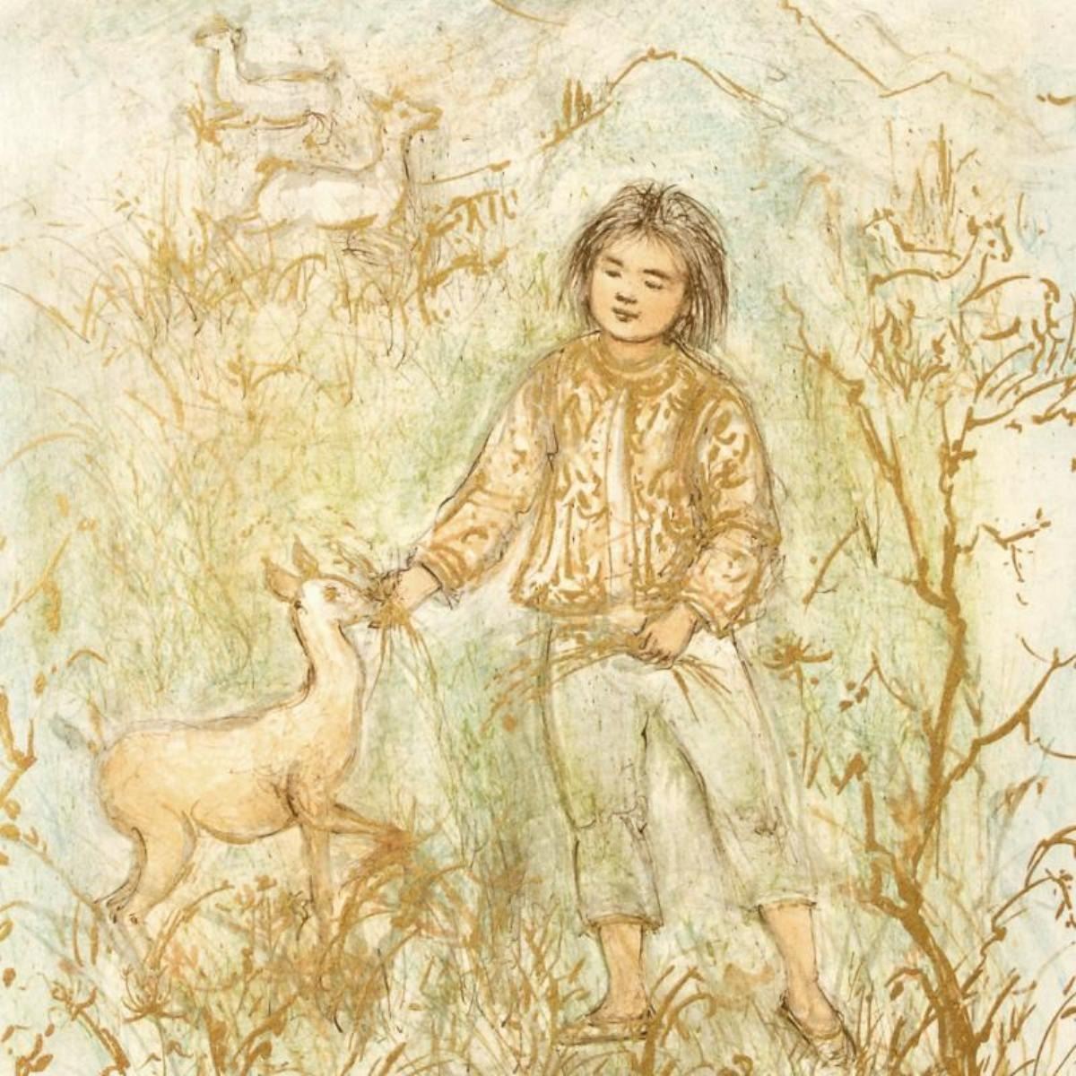 "The Forest Friend" is a limited edition lithograph on japon paper, numbered and hand signed by Edna Hibel (1917-2014). Includes Certificate of Authenticity! Measures approx. 20" x 30" (with border), 16" x 20" (image).