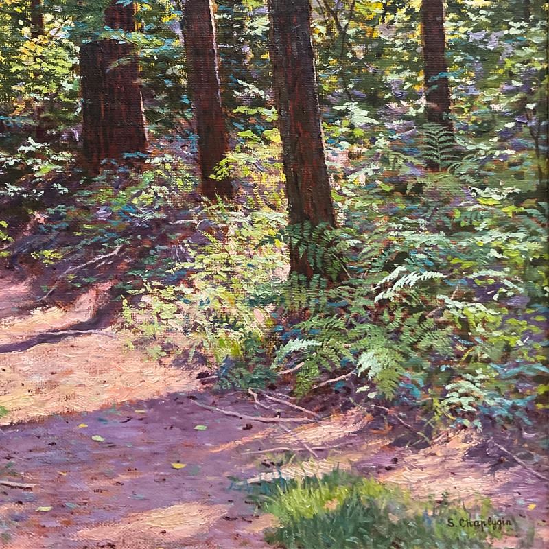 "The Forest Road" is an original oil painting on canvas by Sergey Chaplygin, hand signed by the artist. This piece comes framed. Includes Letter of Authenticity. Measures approx. 38" x 48" (frame), 29" x 39" (image). There is some wear on the frame.