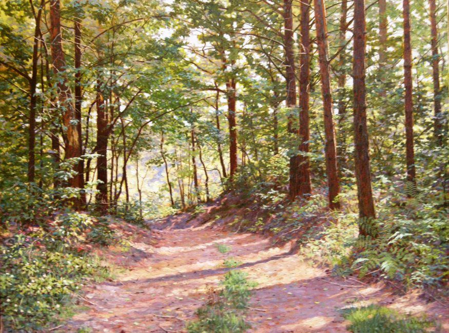 The Forest Road by Sergei Chaplygin is a framed original oil on canvas showing a beautiful sunny path through the forest. The size is 39 3/4" x 49 1/4".