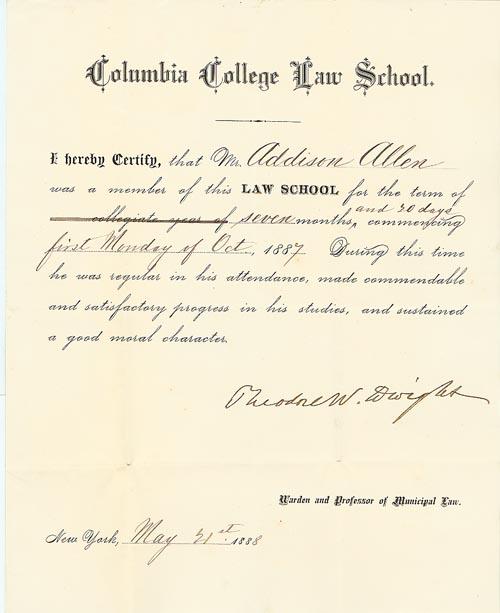 THEODORE DWIGHT. DS. 1pp. 8" x 10". New York. May 31st, 1888. A "Columbia College Law School" document signed "Theodore W. Dwight" as "Warden and Professor of Municipal Law". This document certified that "Mr. Addison Allen was a member of this LAW SCHOOL for the term of seven months and 20 days commencing first Monday of Oct, 1887. During this time, he was regular in his attendance, made commendable and satisfactory progress in his studies, and sustained a good moral character." The piece has the usual folds, but the signature is very dark and the paper is extremely white. It is in very fine condition.