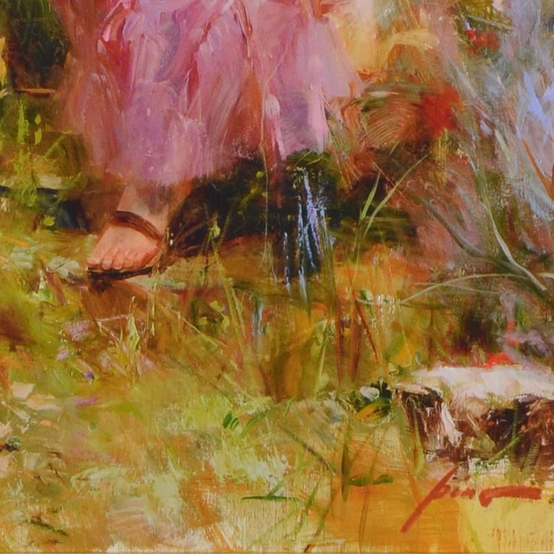 Pino's portraits allow glimpses into intensely personal, intimate spaces, conveying emotion through rich, warm color and sensual brushwork. "The Fountain of Life" is an artist-embellished limited edition giclee on canvas by Pino (1939-2010). The piece is numbered, hand signed, custom framed, and includes certificate of authenticity. Measures approx. 44" x 52" (frame), 32" x 40" (image).