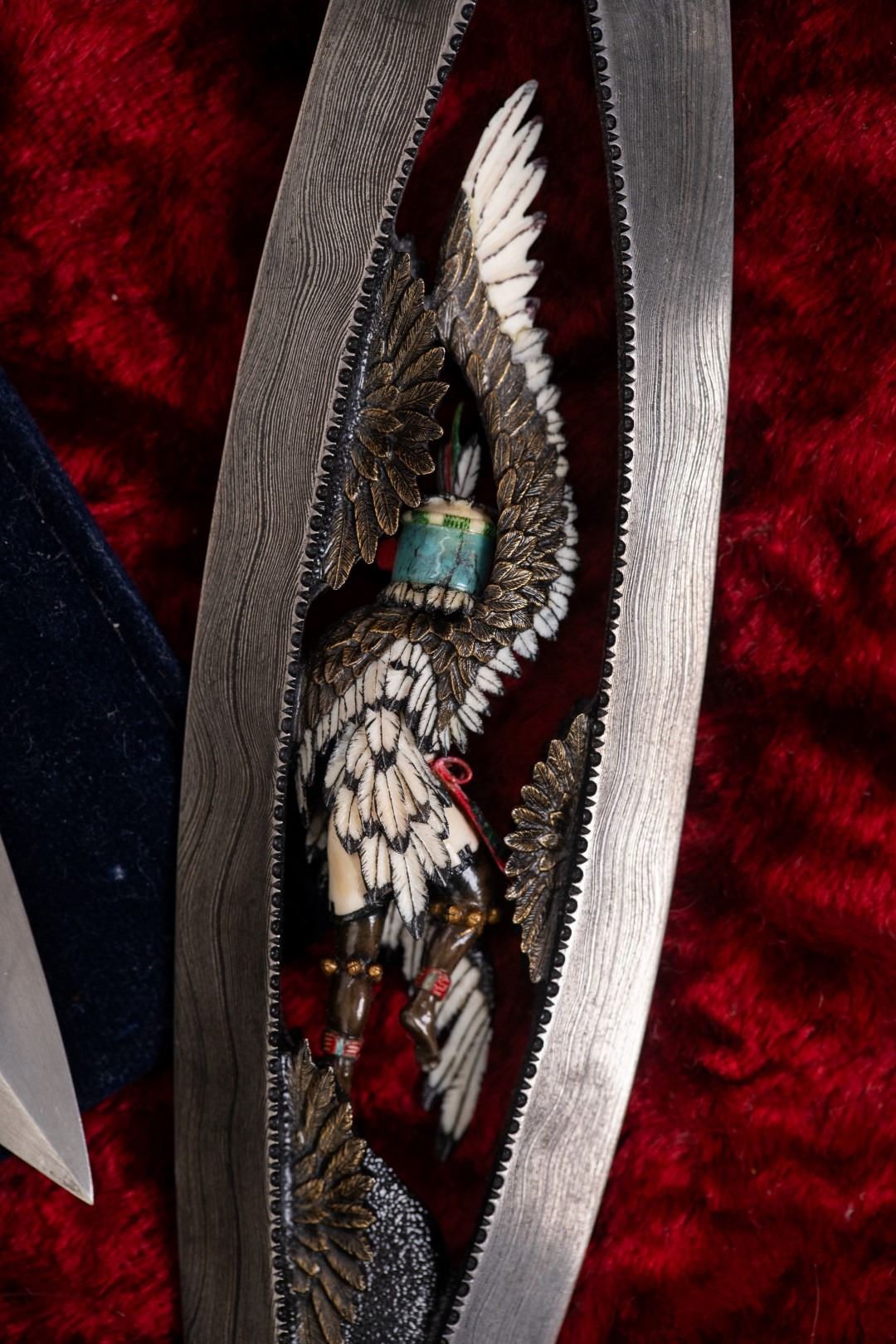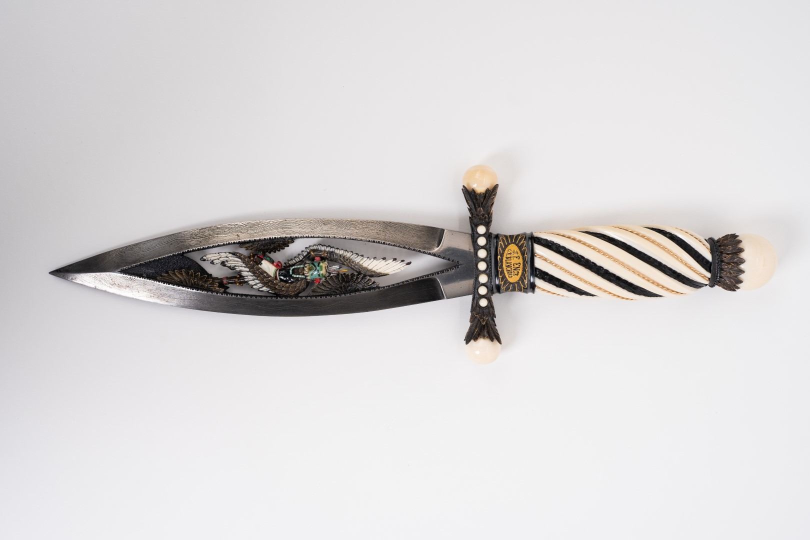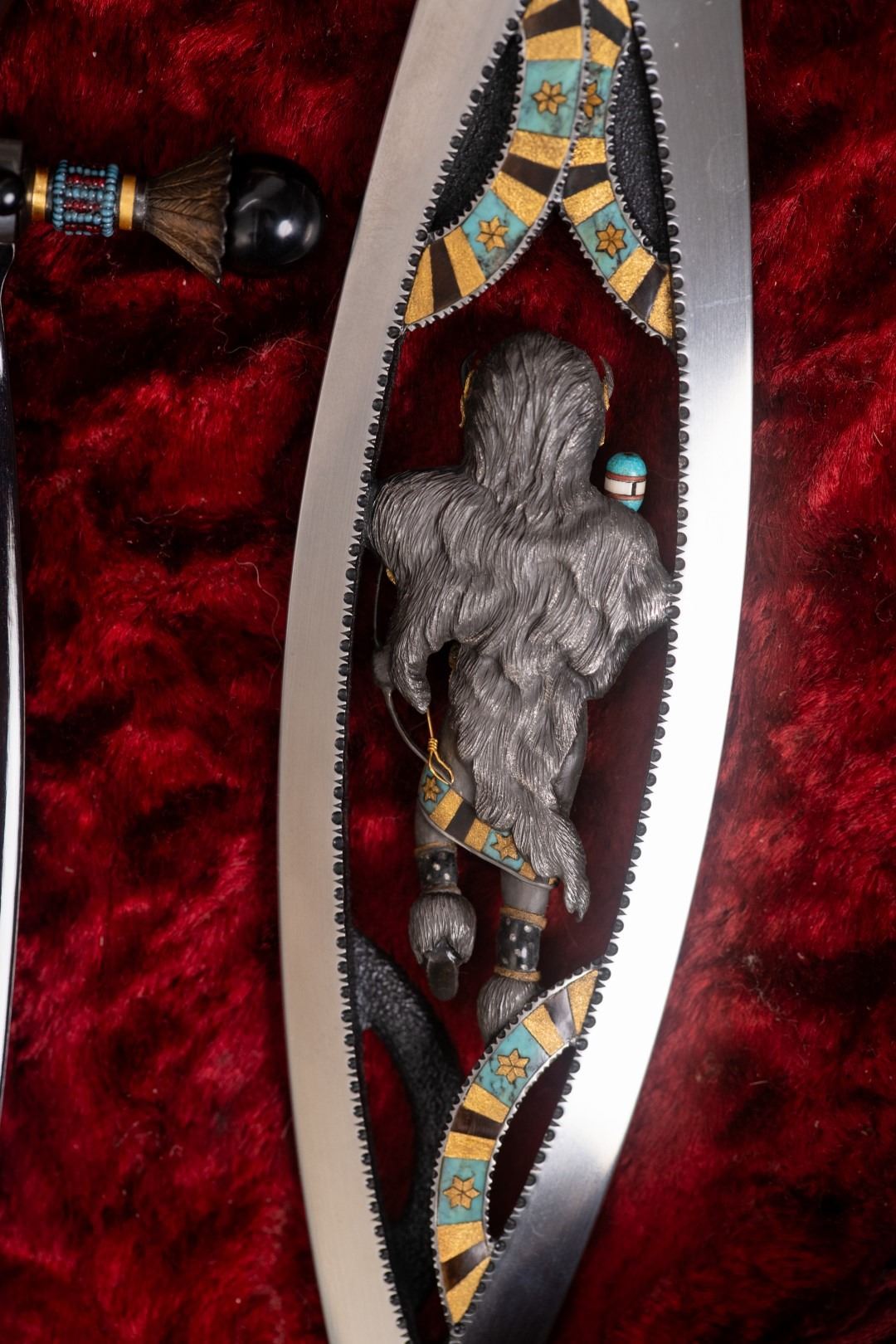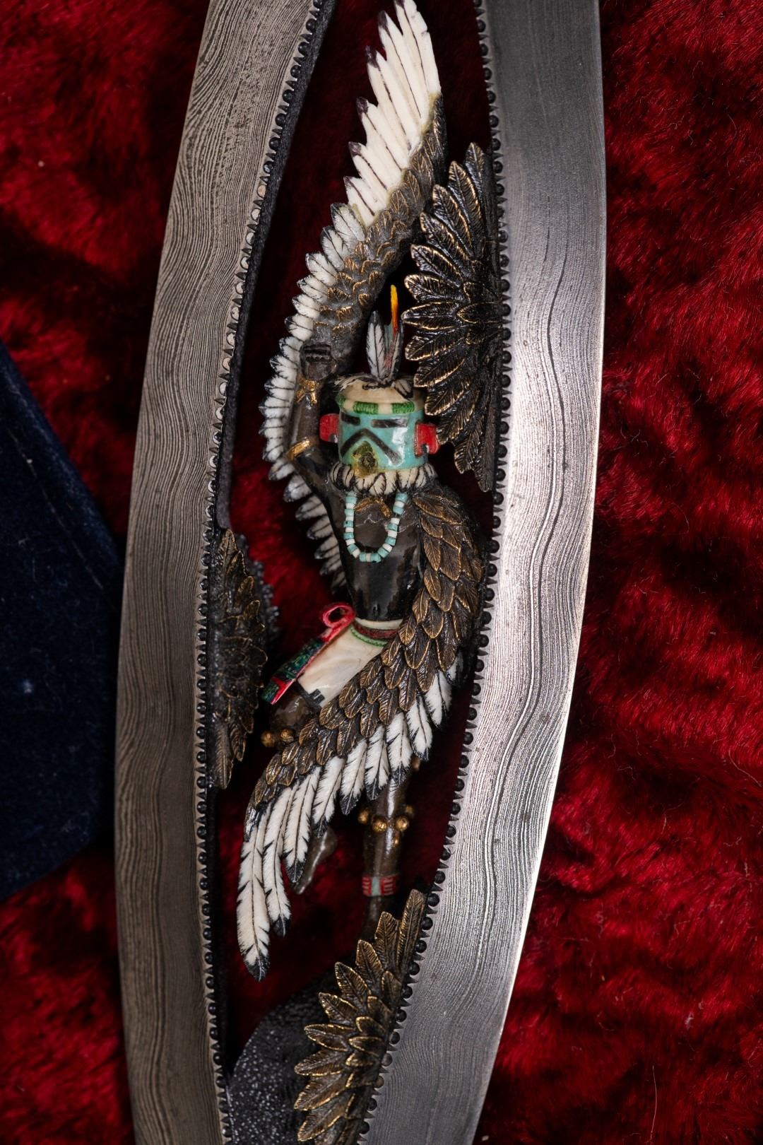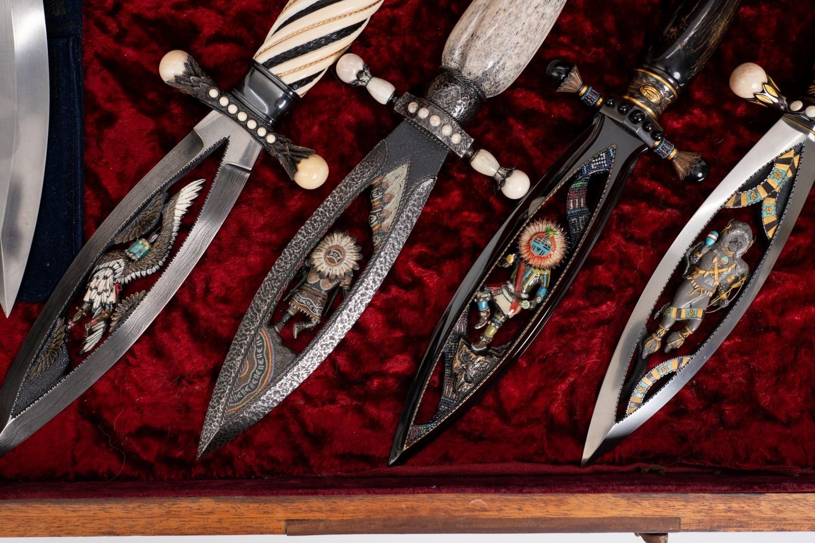 Three Kachina knives were originally Commissioned by J.W. Bailey at the Anaheim Knife show in 1985, Gary Blanchard would collaborate with three knife makers to produce these fantastic daggers. eric Meyers, a world famous knife collector, then bought the three knives & contracted Gary Blanchard to complete the series with a fourth knife. These four handmade art knives then lived in Switzerland, moved to New York, moved again to a ranch in Michigan & then finally came back to California where it all started. The Four Kachina’s were inspired by the ancestral spirits in Pueblo mythology. The original concept & design was by Gary Blachard, he asked Willie Rigney, Jim ence & Billy Mace Imel to work on the project. The plan was to create four custom art daggers with a three dimensional Kachina or Social Dancer carved within the center portion of the blade. Gary was told by the steel company that the process of carving into the steel was impossible, yet here they are. Gary did all the carvings with specific requirements for the shape & detail. This series only had four knives painstakingly hand crafted, each dagger is a one of a kind. Over 2000 combined man-hours to complete the four knives, from 1986 to 1992. Here is a brief description of each custom art dagger. #1: The White Buffalo Dance, the first knife in the series by Willie Rigney & Gary Blanchard. Using 440c, guard & pommel in blued steel & handle of fluted walrus fossil with 24K gold, gold bow string & the small sea shells are individually carved from a cameo shell. #2: The eagle Kachina, by Jime ence & Gary Blanchard. Blade of damascus & blued steel fixtures, the balls of the guard & pommel are ivory as is the handle with 24K gold wire & lizard skin. The embellishment took 480 hours & was completed in 1988. The graceful flowing wings were accomplished by carving each feather out of ivory & inlaying them on at a time. Headdress is made from turquoise. The beak & bells are solid gold & the necklace is carved from ivory & turquoise, then strung on wire. #3: The Sun Kachina, by Billy Mace Imel & Gary Blanchard. With blued steel blade & fixtures, handle is black buffalo horn as are the balls of the guard & the pommel. embellishment of the knife & fixtures took 537 man hours to complete in 1990. This was the first project where Gary used his ceramic resin process, used in the headdress instead of red coral to get the needed detail. Other inlays are turquoise, black buffalo horn, red coral & 24K gold. The beaded bands include over 1500 beads, all were individually hand sanded & fitted into place. #4: The Broad Faced Kachina, the final Kachina by Gary Blachard. The surfaces have been grounded to look as though it had been flint knapped. The handle & other portions of the guard & pommel are made of elk horn. Within the blade, the three dimensional figure is overlaid with colored sand, inlays consist of sand, elk horn, sterling silver & 24K gold. The making of this knife took 560 hours to complete in 1992. each knife is beautifully preserved & in outstanding condition, showing only a few insignificant handling marks. A fifth blade is included, this blank example blade was made by Billy Mace Imel & shows you what a Kachina blade would look like before the carving & embellishment. This lot comes with several items of Provenance, including printed copies of letters by Gary Blanchard & Billy Mace Imel. There is also an outline of the history of the Four Kachina’s. The "White Buffalo Dance'' was featured in Blade Magazine December 1987. The "eagle Kachina" was featured in Knives Illustrated Spring 1988. The "Sun Kachina" featured in a 2014 Japanese Knife Magazine. There is also an included Blade Magazine showing an advertisement of the Four Kachinas. There are many letters & print outs describing the history of these artisan knives. This set comes with a wooden display box with a red velvet interior. The box is in nice condition, showing light to moderate wear. But wait, there's more. Also included is the hardcover book "Modern Custom Knives, The Great Collections" by David Darom. This collectors book features one of the owners of the Four Kachina’s. Also included is a custom made glass & wood display cabinet with fitted acrylic slots to hold each dagger firmly in place. The cabinet has a built in lights, motor & battery pack, the knives rotate in this very nice display. The wood shows light marks & remains in Fine overall condition. These master crafted art daggers belong in a museum. This is a rare once in a lifetime opportunity to own four of arguably the most significant handmade knives in the world.