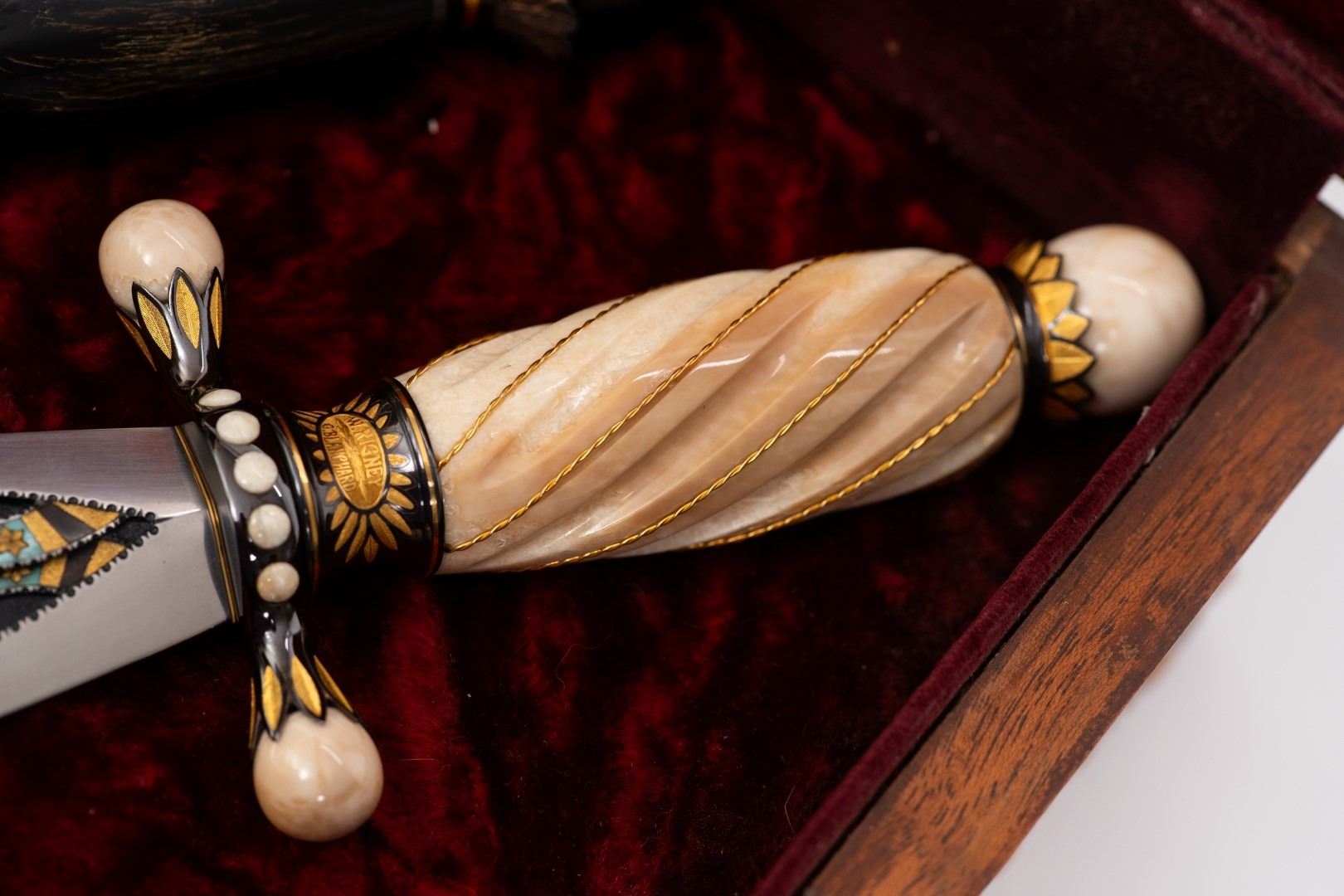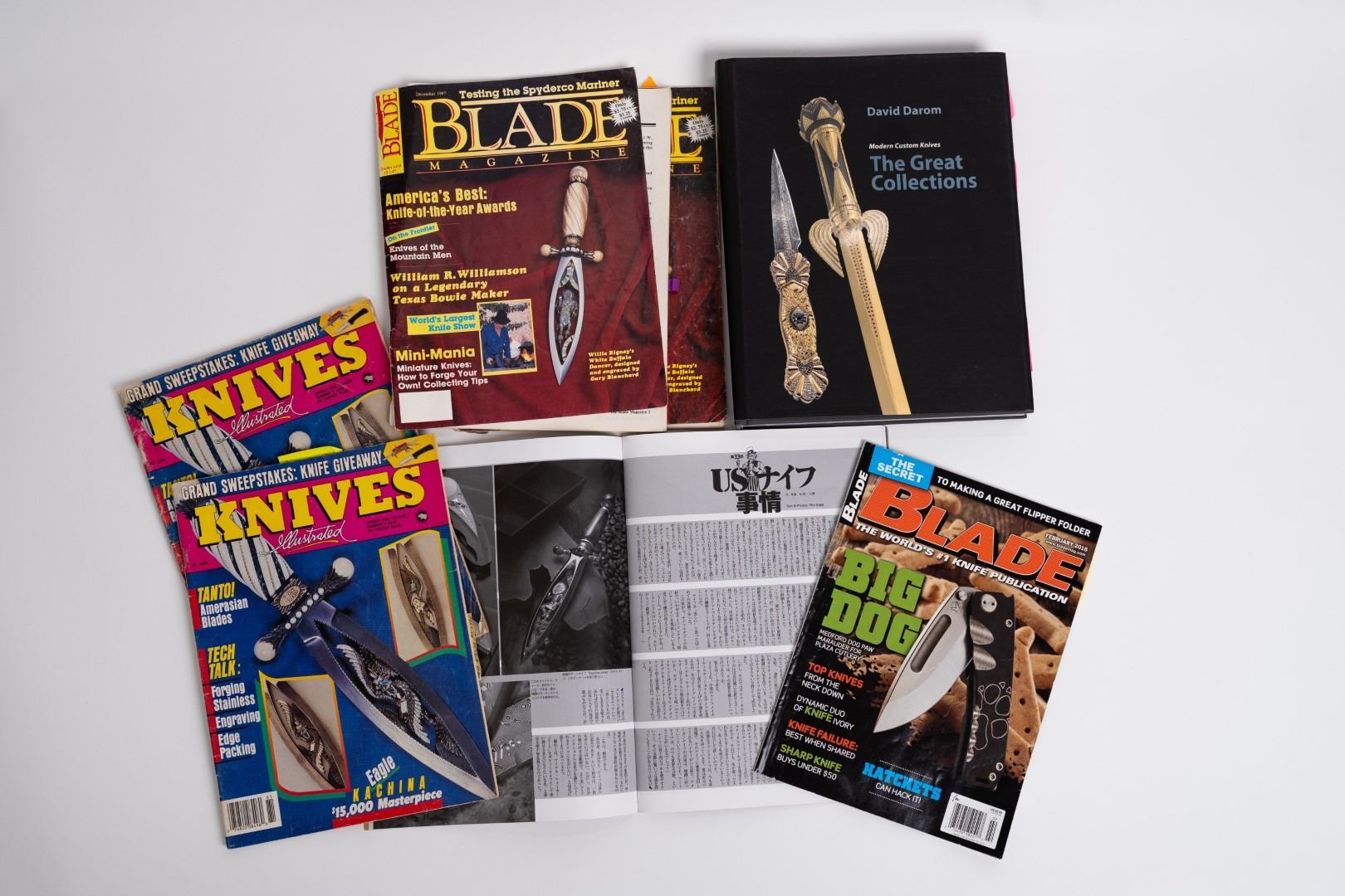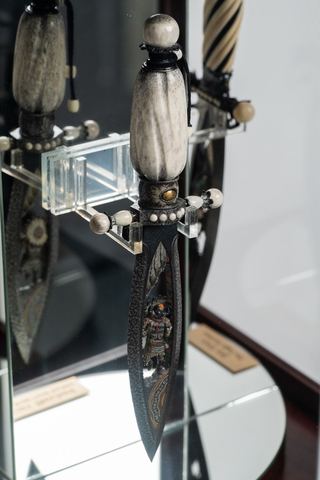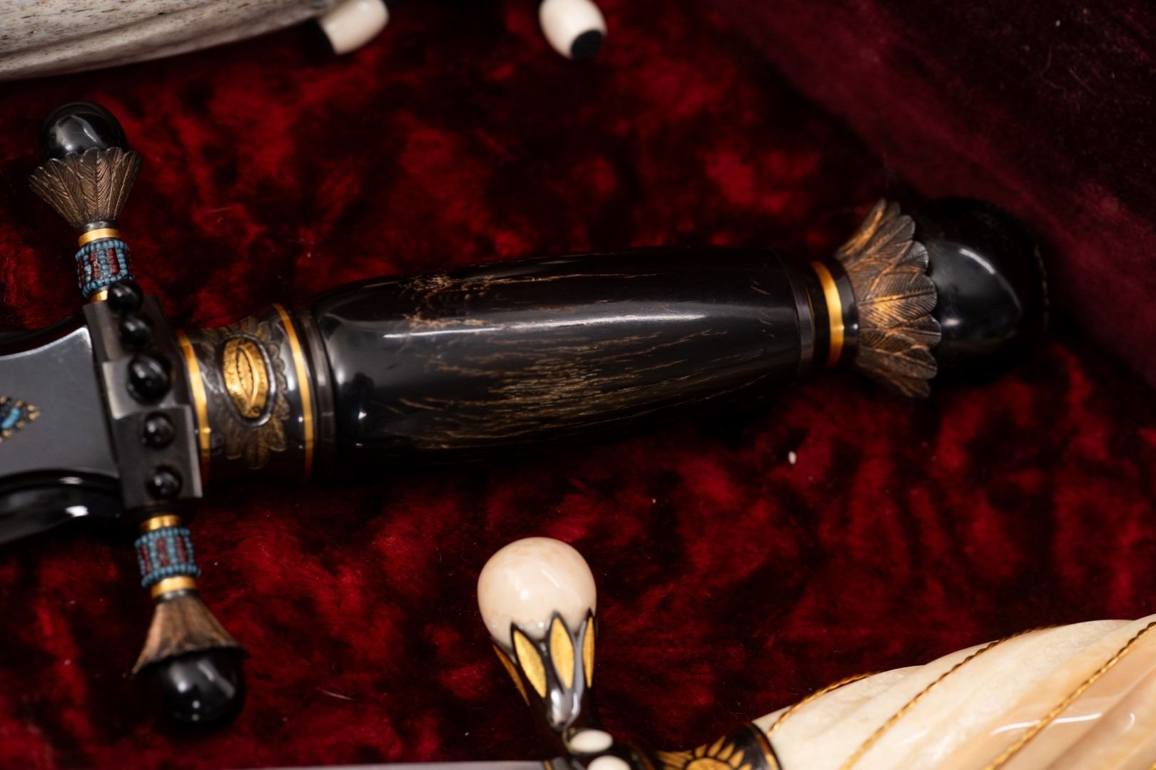 Three Kachina knives were originally Commissioned by J.W. Bailey at the Anaheim Knife show in 1985, Gary Blanchard would collaborate with three knife makers to produce these fantastic daggers. eric Meyers, a world famous knife collector, then bought the three knives & contracted Gary Blanchard to complete the series with a fourth knife. These four handmade art knives then lived in Switzerland, moved to New York, moved again to a ranch in Michigan & then finally came back to California where it all started. The Four Kachina’s were inspired by the ancestral spirits in Pueblo mythology. The original concept & design was by Gary Blachard, he asked Willie Rigney, Jim ence & Billy Mace Imel to work on the project. The plan was to create four custom art daggers with a three dimensional Kachina or Social Dancer carved within the center portion of the blade. Gary was told by the steel company that the process of carving into the steel was impossible, yet here they are. Gary did all the carvings with specific requirements for the shape & detail. This series only had four knives painstakingly hand crafted, each dagger is a one of a kind. Over 2000 combined man-hours to complete the four knives, from 1986 to 1992. Here is a brief description of each custom art dagger. #1: The White Buffalo Dance, the first knife in the series by Willie Rigney & Gary Blanchard. Using 440c, guard & pommel in blued steel & handle of fluted walrus fossil with 24K gold, gold bow string & the small sea shells are individually carved from a cameo shell. #2: The eagle Kachina, by Jime ence & Gary Blanchard. Blade of damascus & blued steel fixtures, the balls of the guard & pommel are ivory as is the handle with 24K gold wire & lizard skin. The embellishment took 480 hours & was completed in 1988. The graceful flowing wings were accomplished by carving each feather out of ivory & inlaying them on at a time. Headdress is made from turquoise. The beak & bells are solid gold & the necklace is carved from ivory & turquoise, then strung on wire. #3: The Sun Kachina, by Billy Mace Imel & Gary Blanchard. With blued steel blade & fixtures, handle is black buffalo horn as are the balls of the guard & the pommel. embellishment of the knife & fixtures took 537 man hours to complete in 1990. This was the first project where Gary used his ceramic resin process, used in the headdress instead of red coral to get the needed detail. Other inlays are turquoise, black buffalo horn, red coral & 24K gold. The beaded bands include over 1500 beads, all were individually hand sanded & fitted into place. #4: The Broad Faced Kachina, the final Kachina by Gary Blachard. The surfaces have been grounded to look as though it had been flint knapped. The handle & other portions of the guard & pommel are made of elk horn. Within the blade, the three dimensional figure is overlaid with colored sand, inlays consist of sand, elk horn, sterling silver & 24K gold. The making of this knife took 560 hours to complete in 1992. each knife is beautifully preserved & in outstanding condition, showing only a few insignificant handling marks. A fifth blade is included, this blank example blade was made by Billy Mace Imel & shows you what a Kachina blade would look like before the carving & embellishment. This lot comes with several items of Provenance, including printed copies of letters by Gary Blanchard & Billy Mace Imel. There is also an outline of the history of the Four Kachina’s. The "White Buffalo Dance'' was featured in Blade Magazine December 1987. The "eagle Kachina" was featured in Knives Illustrated Spring 1988. The "Sun Kachina" featured in a 2014 Japanese Knife Magazine. There is also an included Blade Magazine showing an advertisement of the Four Kachinas. There are many letters & print outs describing the history of these artisan knives. This set comes with a wooden display box with a red velvet interior. The box is in nice condition, showing light to moderate wear. But wait, there's more. Also included is the hardcover book "Modern Custom Knives, The Great Collections" by David Darom. This collectors book features one of the owners of the Four Kachina’s. Also included is a custom made glass & wood display cabinet with fitted acrylic slots to hold each dagger firmly in place. The cabinet has a built in lights, motor & battery pack, the knives rotate in this very nice display. The wood shows light marks & remains in Fine overall condition. These master crafted art daggers belong in a museum. This is a rare once in a lifetime opportunity to own four of arguably the most significant handmade knives in the world.