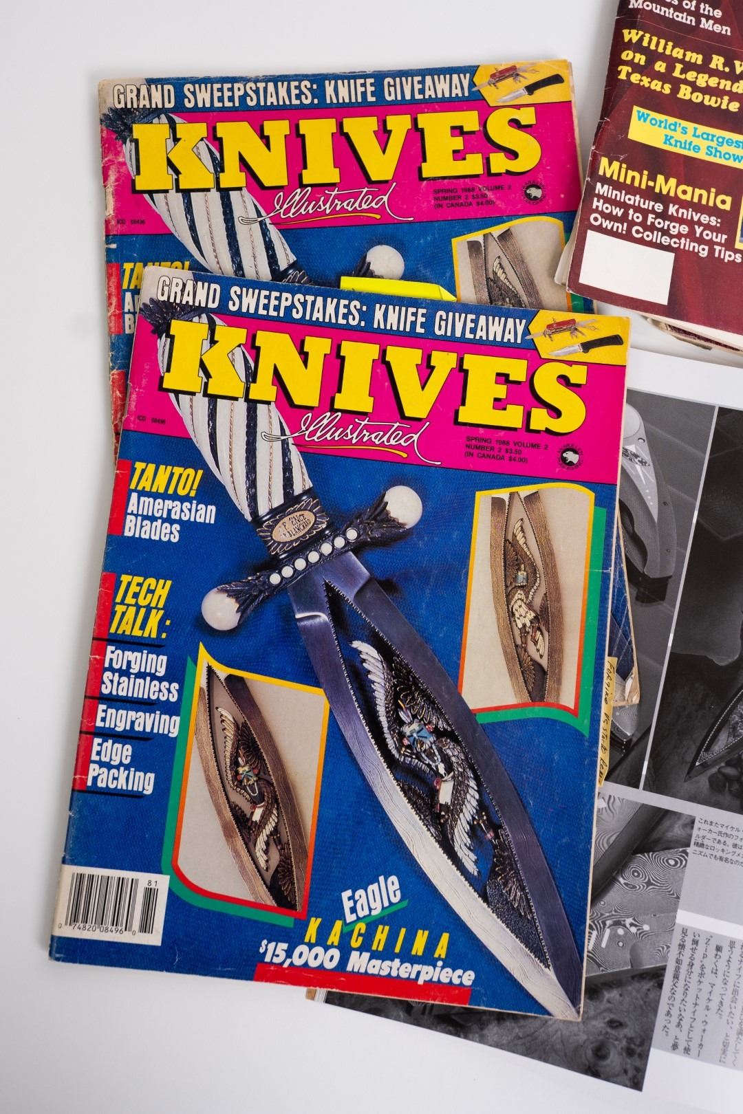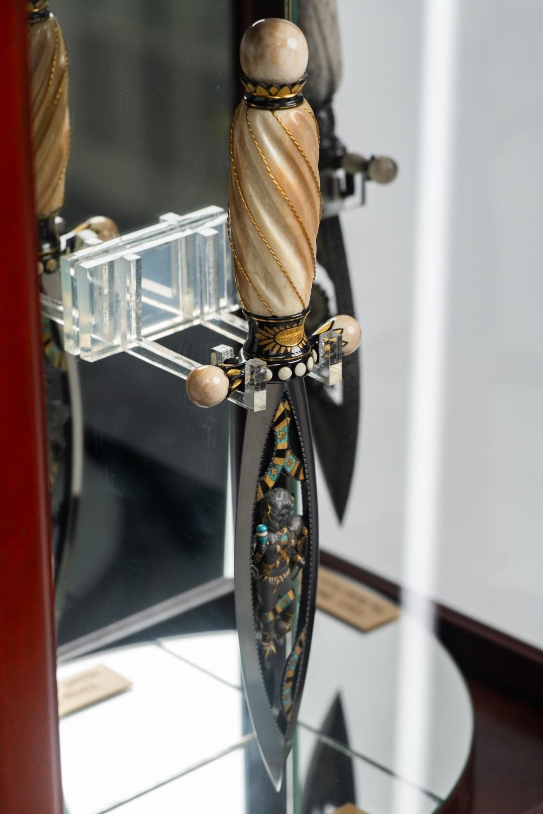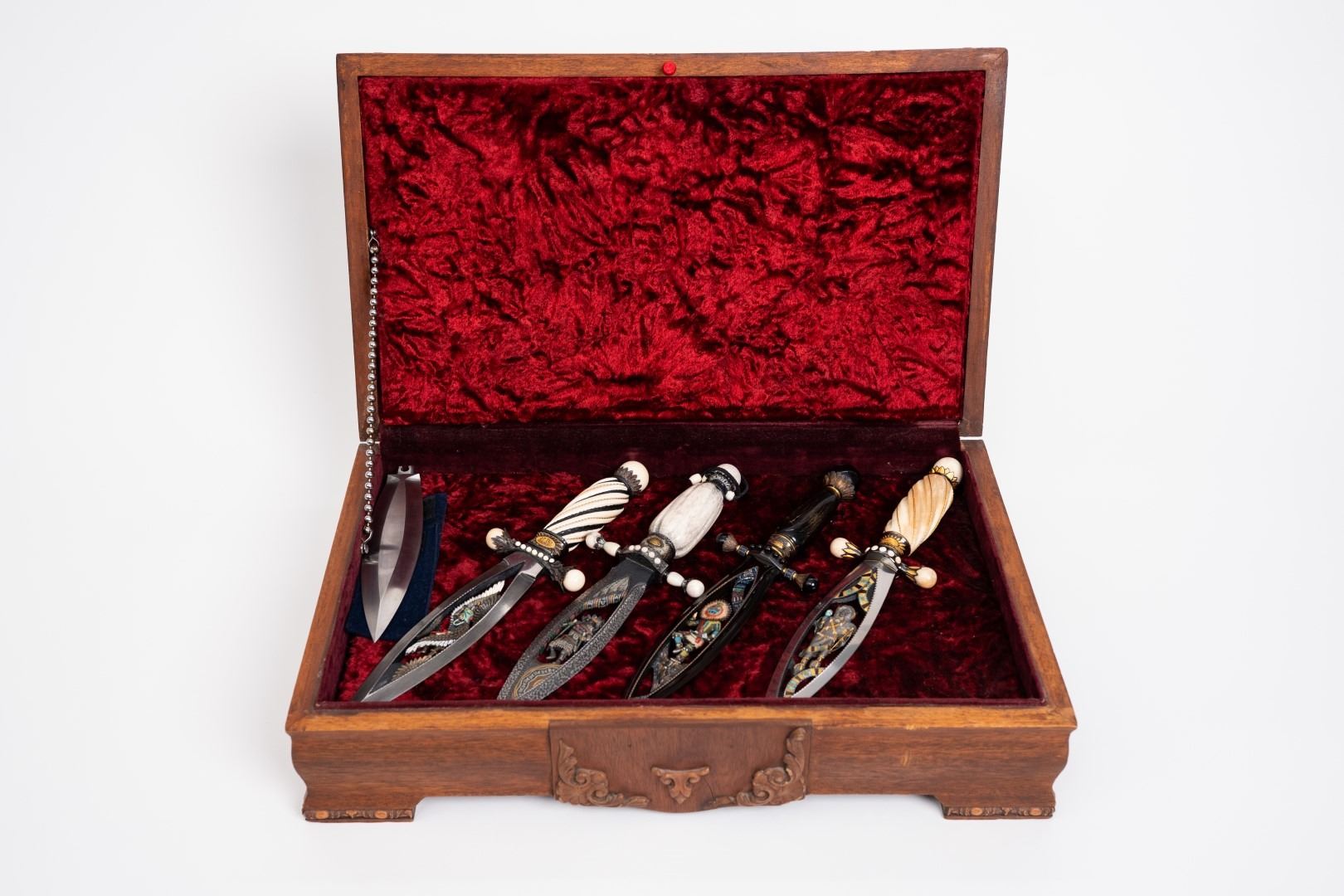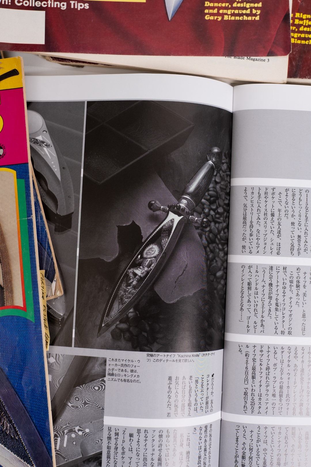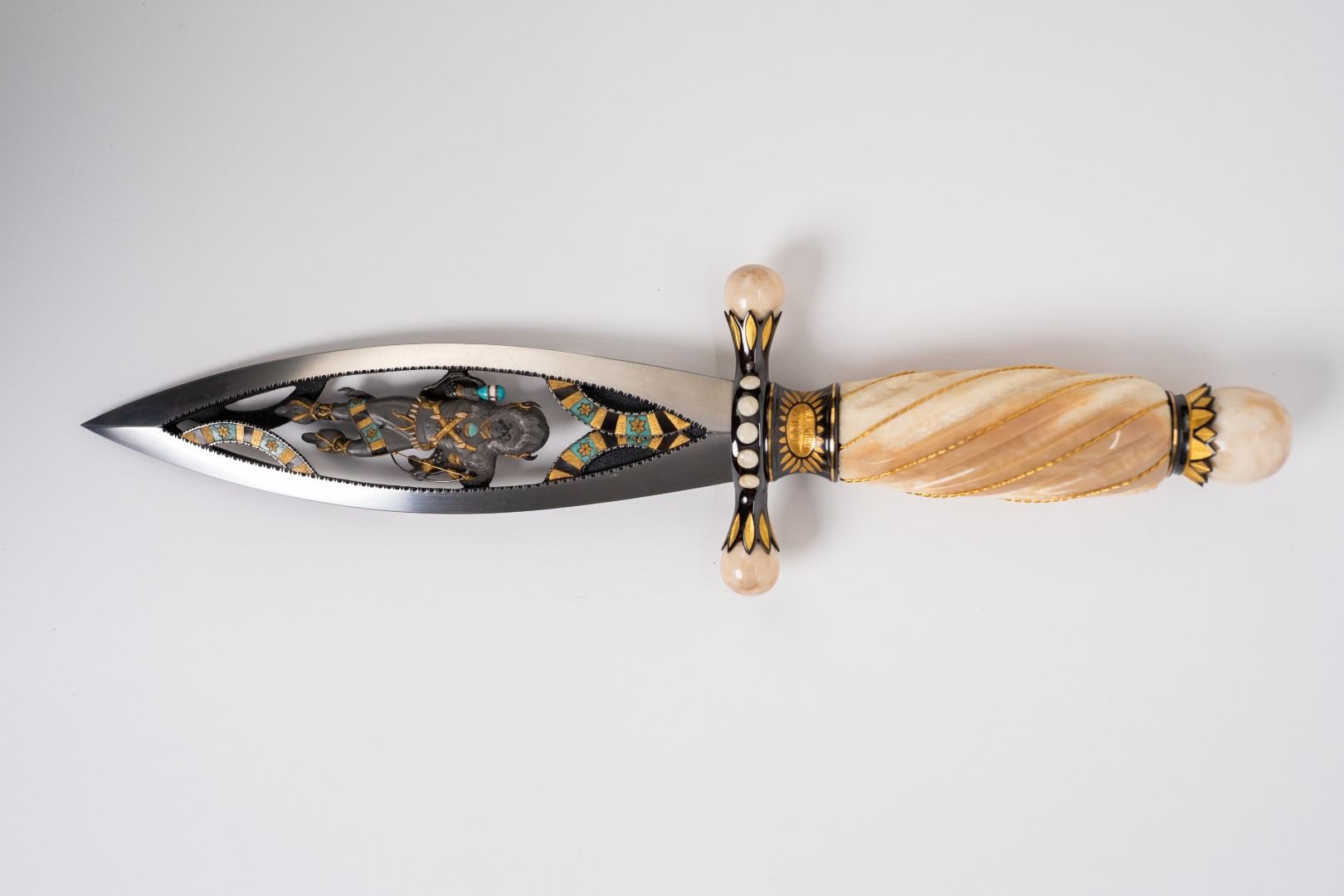 Three Kachina knives were originally Commissioned by J.W. Bailey at the Anaheim Knife show in 1985, Gary Blanchard would collaborate with three knife makers to produce these fantastic daggers. eric Meyers, a world famous knife collector, then bought the three knives & contracted Gary Blanchard to complete the series with a fourth knife. These four handmade art knives then lived in Switzerland, moved to New York, moved again to a ranch in Michigan & then finally came back to California where it all started. The Four Kachina’s were inspired by the ancestral spirits in Pueblo mythology. The original concept & design was by Gary Blachard, he asked Willie Rigney, Jim ence & Billy Mace Imel to work on the project. The plan was to create four custom art daggers with a three dimensional Kachina or Social Dancer carved within the center portion of the blade. Gary was told by the steel company that the process of carving into the steel was impossible, yet here they are. Gary did all the carvings with specific requirements for the shape & detail. This series only had four knives painstakingly hand crafted, each dagger is a one of a kind. Over 2000 combined man-hours to complete the four knives, from 1986 to 1992. Here is a brief description of each custom art dagger. #1: The White Buffalo Dance, the first knife in the series by Willie Rigney & Gary Blanchard. Using 440c, guard & pommel in blued steel & handle of fluted walrus fossil with 24K gold, gold bow string & the small sea shells are individually carved from a cameo shell. #2: The eagle Kachina, by Jime ence & Gary Blanchard. Blade of damascus & blued steel fixtures, the balls of the guard & pommel are ivory as is the handle with 24K gold wire & lizard skin. The embellishment took 480 hours & was completed in 1988. The graceful flowing wings were accomplished by carving each feather out of ivory & inlaying them on at a time. Headdress is made from turquoise. The beak & bells are solid gold & the necklace is carved from ivory & turquoise, then strung on wire. #3: The Sun Kachina, by Billy Mace Imel & Gary Blanchard. With blued steel blade & fixtures, handle is black buffalo horn as are the balls of the guard & the pommel. embellishment of the knife & fixtures took 537 man hours to complete in 1990. This was the first project where Gary used his ceramic resin process, used in the headdress instead of red coral to get the needed detail. Other inlays are turquoise, black buffalo horn, red coral & 24K gold. The beaded bands include over 1500 beads, all were individually hand sanded & fitted into place. #4: The Broad Faced Kachina, the final Kachina by Gary Blachard. The surfaces have been grounded to look as though it had been flint knapped. The handle & other portions of the guard & pommel are made of elk horn. Within the blade, the three dimensional figure is overlaid with colored sand, inlays consist of sand, elk horn, sterling silver & 24K gold. The making of this knife took 560 hours to complete in 1992. each knife is beautifully preserved & in outstanding condition, showing only a few insignificant handling marks. A fifth blade is included, this blank example blade was made by Billy Mace Imel & shows you what a Kachina blade would look like before the carving & embellishment. This lot comes with several items of Provenance, including printed copies of letters by Gary Blanchard & Billy Mace Imel. There is also an outline of the history of the Four Kachina’s. The "White Buffalo Dance'' was featured in Blade Magazine December 1987. The "eagle Kachina" was featured in Knives Illustrated Spring 1988. The "Sun Kachina" featured in a 2014 Japanese Knife Magazine. There is also an included Blade Magazine showing an advertisement of the Four Kachinas. There are many letters & print outs describing the history of these artisan knives. This set comes with a wooden display box with a red velvet interior. The box is in nice condition, showing light to moderate wear. But wait, there's more. Also included is the hardcover book "Modern Custom Knives, The Great Collections" by David Darom. This collectors book features one of the owners of the Four Kachina’s. Also included is a custom made glass & wood display cabinet with fitted acrylic slots to hold each dagger firmly in place. The cabinet has a built in lights, motor & battery pack, the knives rotate in this very nice display. The wood shows light marks & remains in Fine overall condition. These master crafted art daggers belong in a museum. This is a rare once in a lifetime opportunity to own four of arguably the most significant handmade knives in the world.