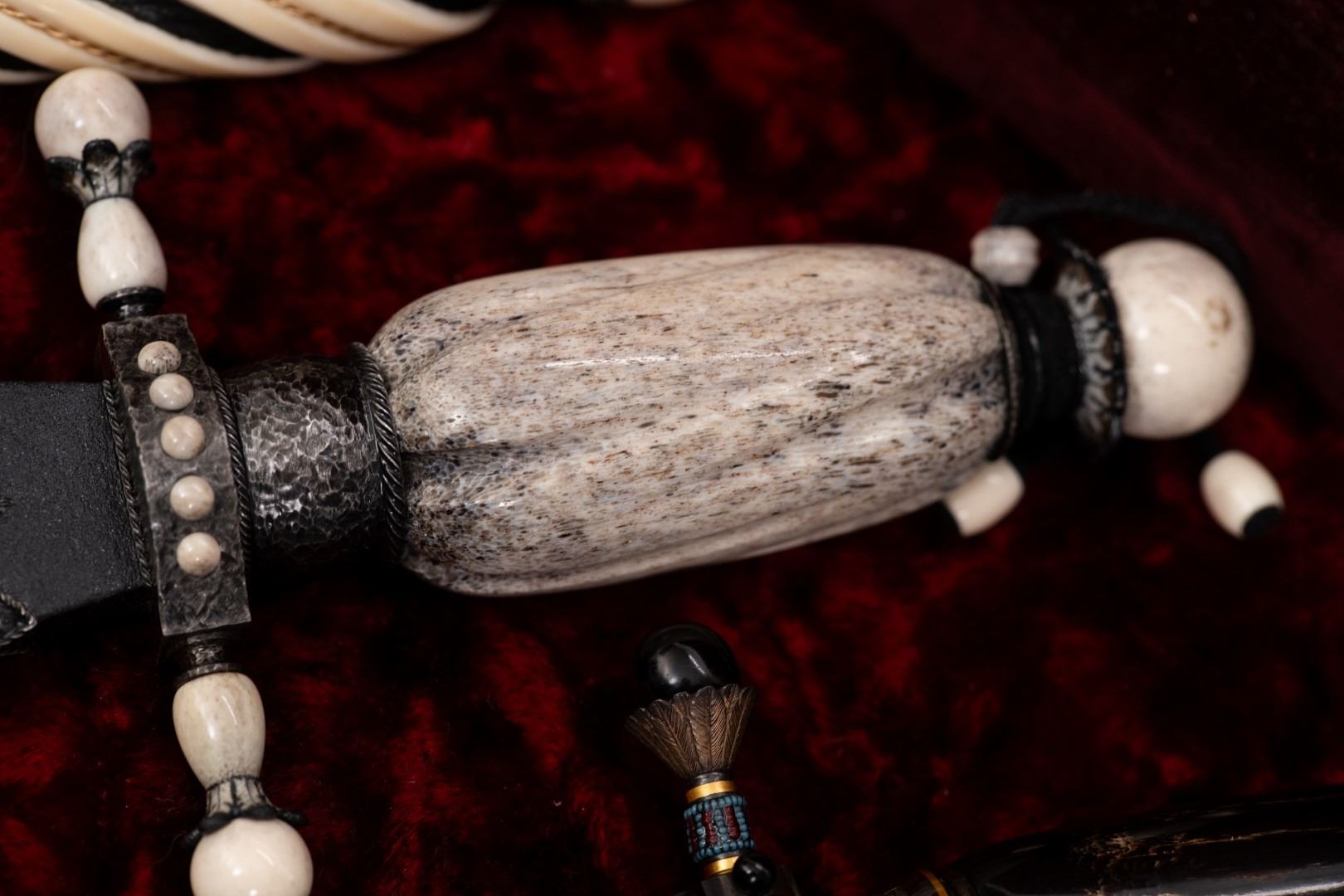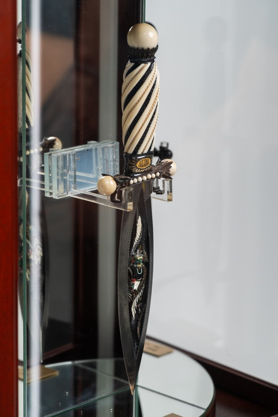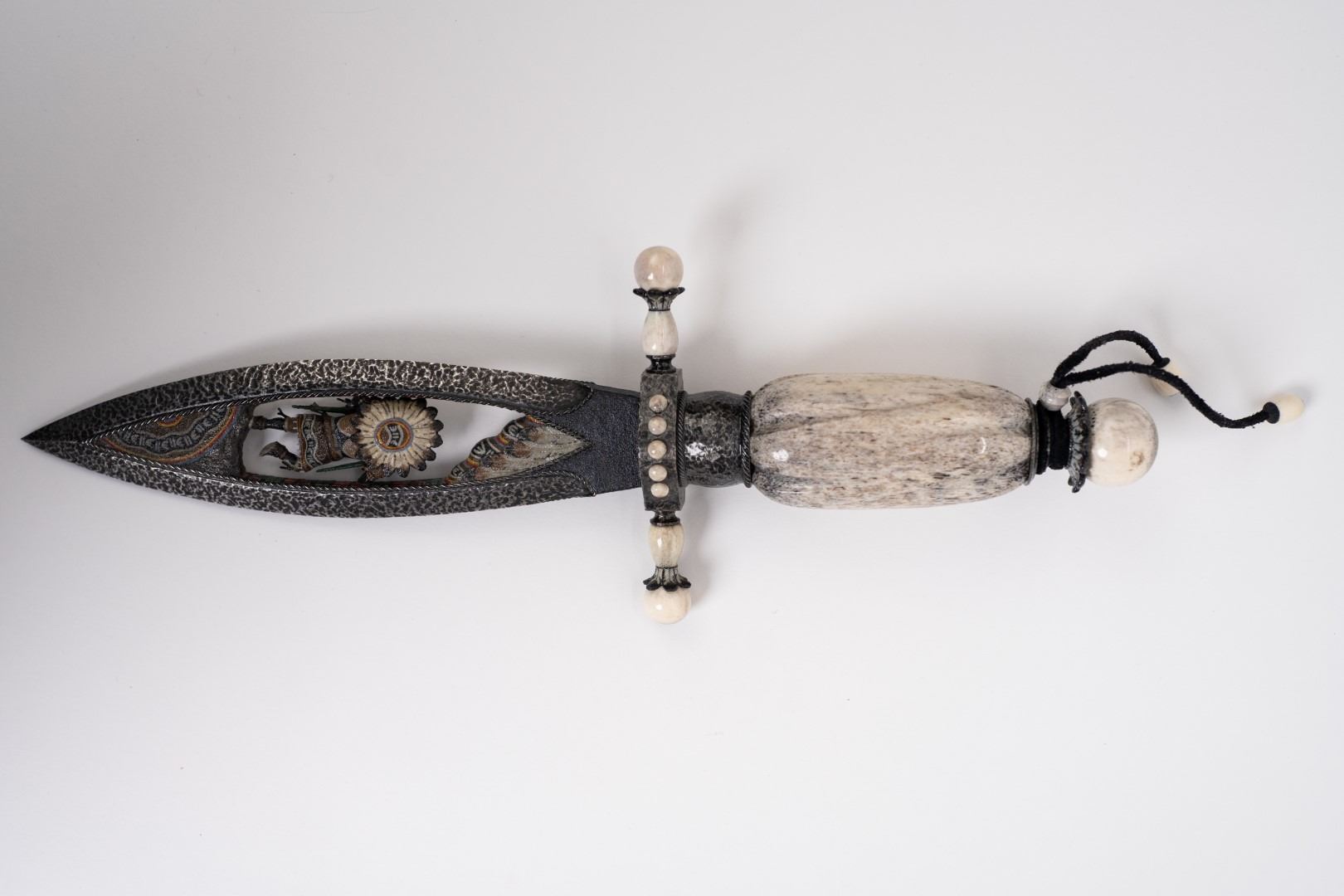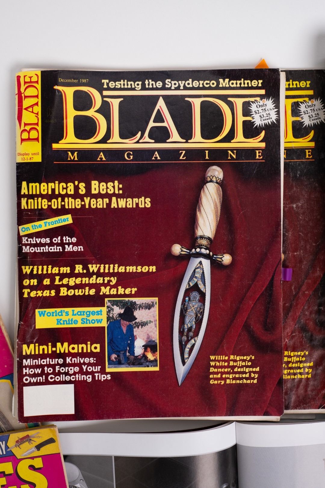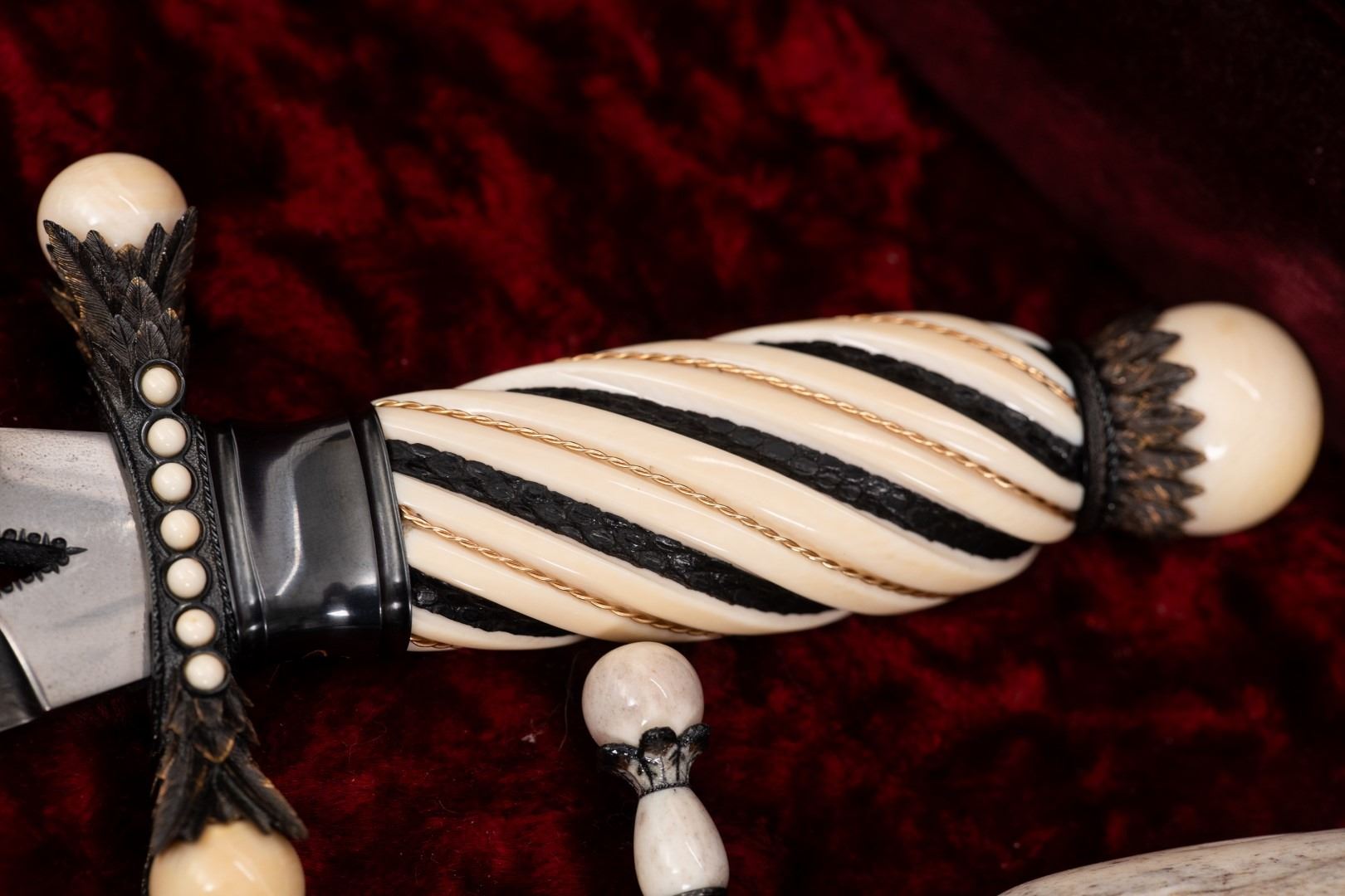 Three Kachina knives were originally Commissioned by J.W. Bailey at the Anaheim Knife show in 1985, Gary Blanchard would collaborate with three knife makers to produce these fantastic daggers. eric Meyers, a world famous knife collector, then bought the three knives & contracted Gary Blanchard to complete the series with a fourth knife. These four handmade art knives then lived in Switzerland, moved to New York, moved again to a ranch in Michigan & then finally came back to California where it all started. The Four Kachina’s were inspired by the ancestral spirits in Pueblo mythology. The original concept & design was by Gary Blachard, he asked Willie Rigney, Jim ence & Billy Mace Imel to work on the project. The plan was to create four custom art daggers with a three dimensional Kachina or Social Dancer carved within the center portion of the blade. Gary was told by the steel company that the process of carving into the steel was impossible, yet here they are. Gary did all the carvings with specific requirements for the shape & detail. This series only had four knives painstakingly hand crafted, each dagger is a one of a kind. Over 2000 combined man-hours to complete the four knives, from 1986 to 1992. Here is a brief description of each custom art dagger. #1: The White Buffalo Dance, the first knife in the series by Willie Rigney & Gary Blanchard. Using 440c, guard & pommel in blued steel & handle of fluted walrus fossil with 24K gold, gold bow string & the small sea shells are individually carved from a cameo shell. #2: The eagle Kachina, by Jime ence & Gary Blanchard. Blade of damascus & blued steel fixtures, the balls of the guard & pommel are ivory as is the handle with 24K gold wire & lizard skin. The embellishment took 480 hours & was completed in 1988. The graceful flowing wings were accomplished by carving each feather out of ivory & inlaying them on at a time. Headdress is made from turquoise. The beak & bells are solid gold & the necklace is carved from ivory & turquoise, then strung on wire. #3: The Sun Kachina, by Billy Mace Imel & Gary Blanchard. With blued steel blade & fixtures, handle is black buffalo horn as are the balls of the guard & the pommel. embellishment of the knife & fixtures took 537 man hours to complete in 1990. This was the first project where Gary used his ceramic resin process, used in the headdress instead of red coral to get the needed detail. Other inlays are turquoise, black buffalo horn, red coral & 24K gold. The beaded bands include over 1500 beads, all were individually hand sanded & fitted into place. #4: The Broad Faced Kachina, the final Kachina by Gary Blachard. The surfaces have been grounded to look as though it had been flint knapped. The handle & other portions of the guard & pommel are made of elk horn. Within the blade, the three dimensional figure is overlaid with colored sand, inlays consist of sand, elk horn, sterling silver & 24K gold. The making of this knife took 560 hours to complete in 1992. each knife is beautifully preserved & in outstanding condition, showing only a few insignificant handling marks. A fifth blade is included, this blank example blade was made by Billy Mace Imel & shows you what a Kachina blade would look like before the carving & embellishment. This lot comes with several items of Provenance, including printed copies of letters by Gary Blanchard & Billy Mace Imel. There is also an outline of the history of the Four Kachina’s. The "White Buffalo Dance'' was featured in Blade Magazine December 1987. The "eagle Kachina" was featured in Knives Illustrated Spring 1988. The "Sun Kachina" featured in a 2014 Japanese Knife Magazine. There is also an included Blade Magazine showing an advertisement of the Four Kachinas. There are many letters & print outs describing the history of these artisan knives. This set comes with a wooden display box with a red velvet interior. The box is in nice condition, showing light to moderate wear. But wait, there's more. Also included is the hardcover book "Modern Custom Knives, The Great Collections" by David Darom. This collectors book features one of the owners of the Four Kachina’s. Also included is a custom made glass & wood display cabinet with fitted acrylic slots to hold each dagger firmly in place. The cabinet has a built in lights, motor & battery pack, the knives rotate in this very nice display. The wood shows light marks & remains in Fine overall condition. These master crafted art daggers belong in a museum. This is a rare once in a lifetime opportunity to own four of arguably the most significant handmade knives in the world.