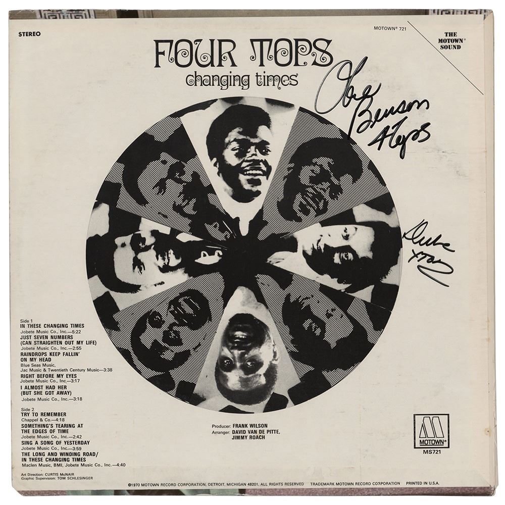 Changing Times album by the Four Tops, signed on the front cover in black felt tip by Levi Stubbs, Lawrence Payton, Duke Fakir, and Obie Benson, with the latter two also signing on the back cover. In fine condition. The record is included. An unusual example in that each band member has signed with their full names; historically, members typically signed first name only with the addition of the band name. The consignor notes that the Four Tops originally signed this album as a favor for David Gest.