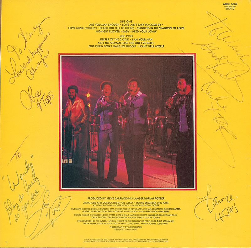 Live & In Concert album signed on the back cover in ink by Duke Fakir, Lawrence Payton, Obie Benson, and Levi Stubbs, all signing first name only, with two adding inscriptions to “Wendy.” In fine condition, with separation to bottom edge. The record is not included. Accompanied by a full letter of authenticity from Roger Epperson/REAL.