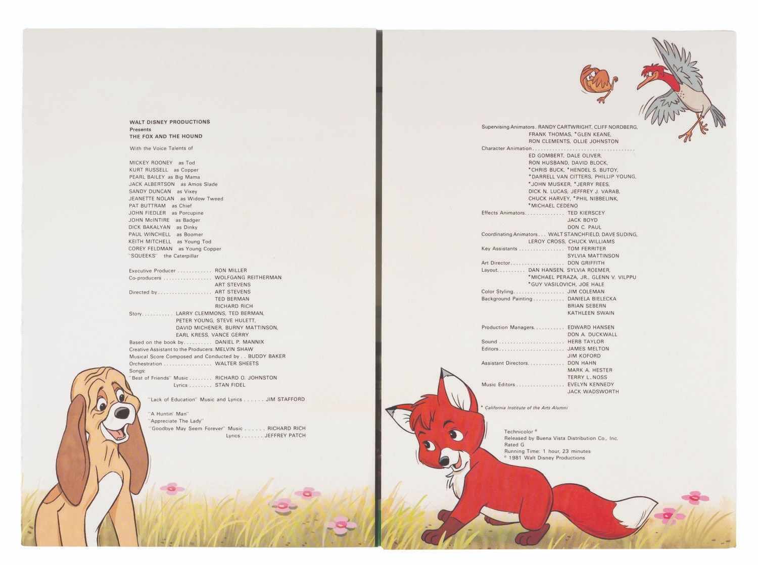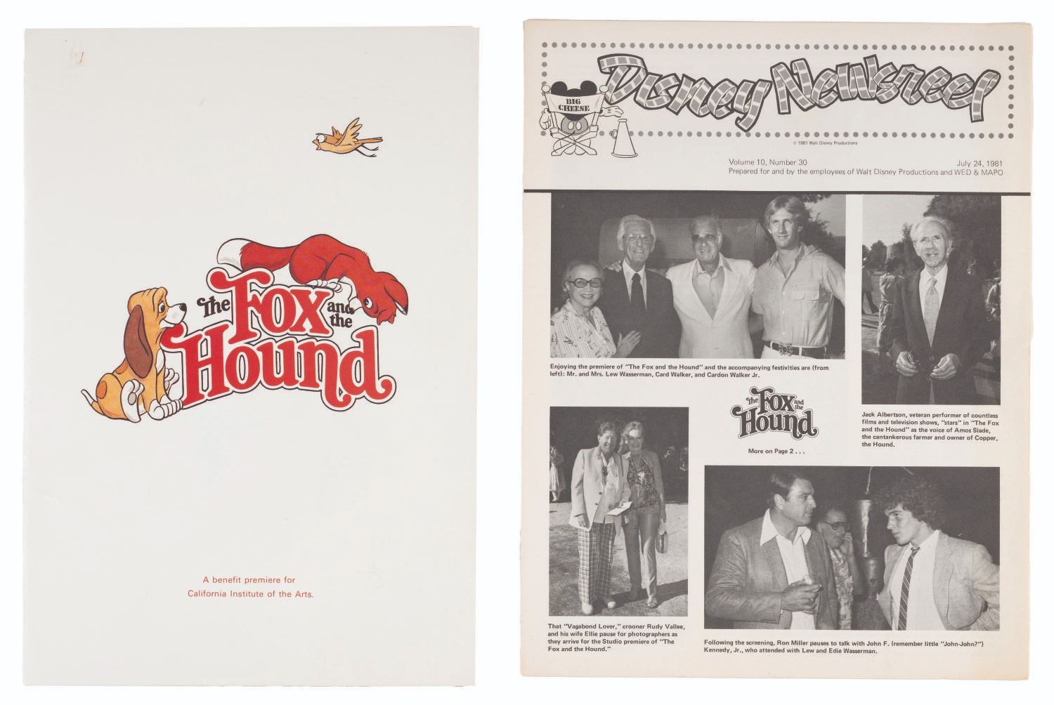 (Disney, 1980-1981) Three “The Fox and the Hound” theatrical release souvenirs. Included are a Vol. 10 No. 30 issue of Disney Newsreel from 1981 highlighting the new film, a "The Fox and the Hound" program for the benefit premiere for the California Institute of the Arts, and a ticket for the film at the Studio Theatre on Friday, July 10, 1980, a full year before the film's theatrical release. Ranging in size from 3.75” x 4.25” to 8.5” x 11”, the items are in good to very good condition with light scratches, wear, and discoloration from age.