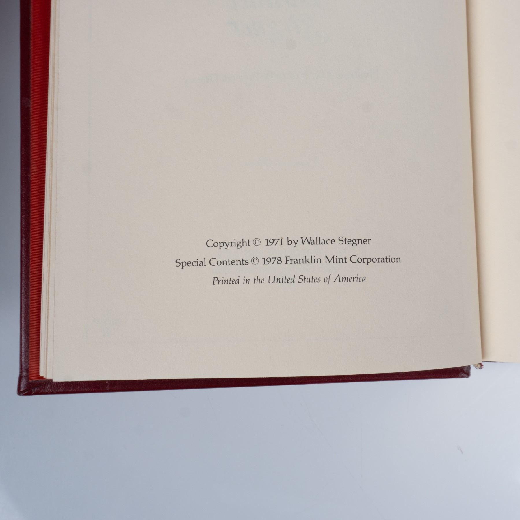 Pulitzer Prize winner 1972. Red leather with gilded design and gilded edge pages. A novel about Lyman Ward, a wheelchair-bound historian who lost his connection with his living family. He writes about his frontier-era grandparents,
