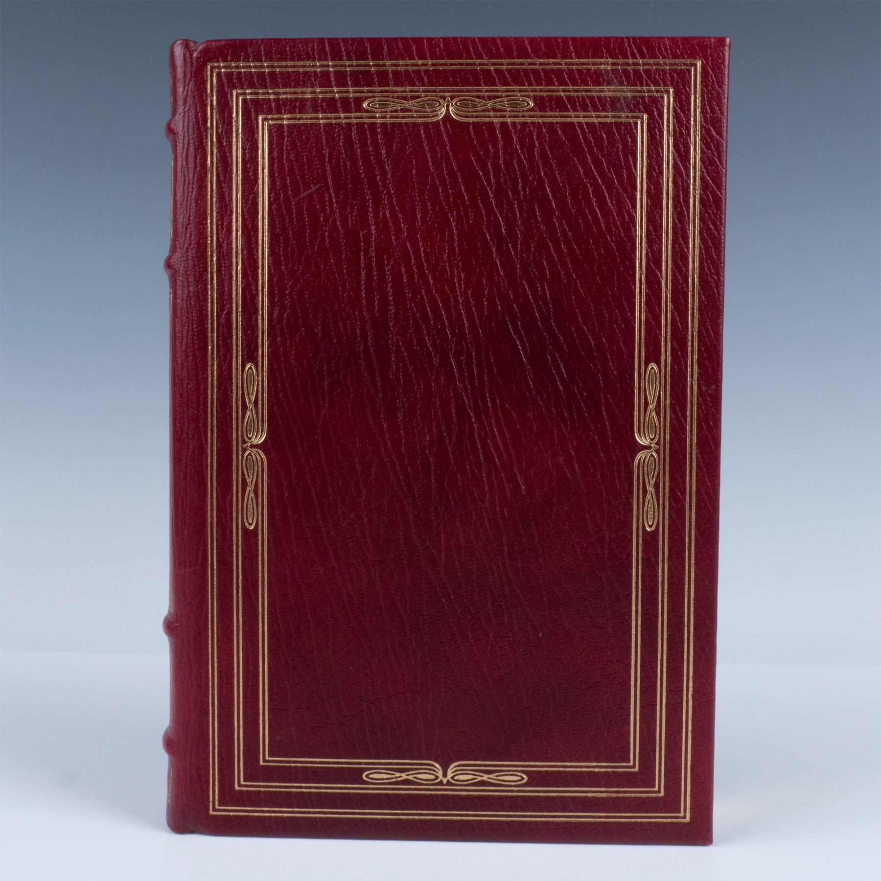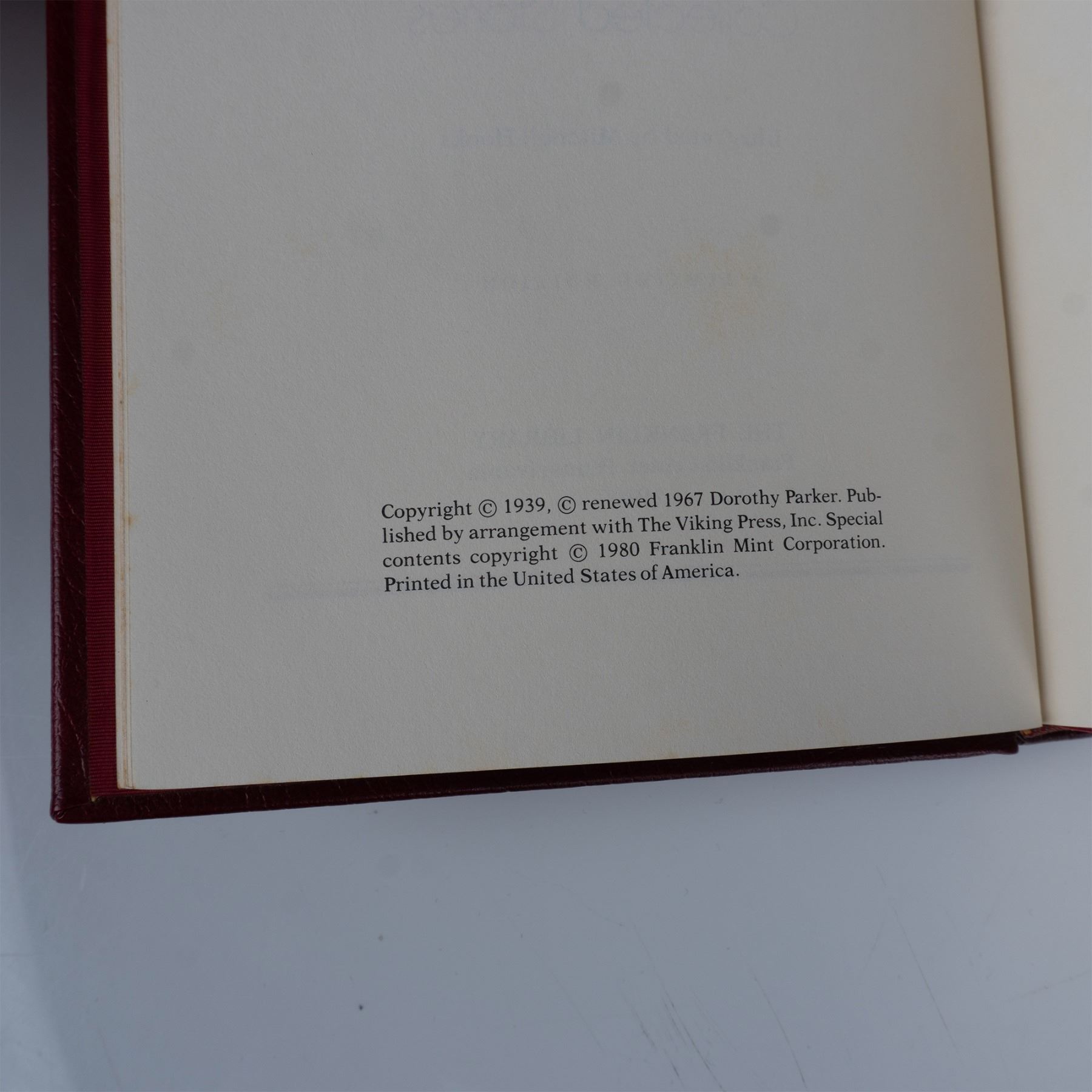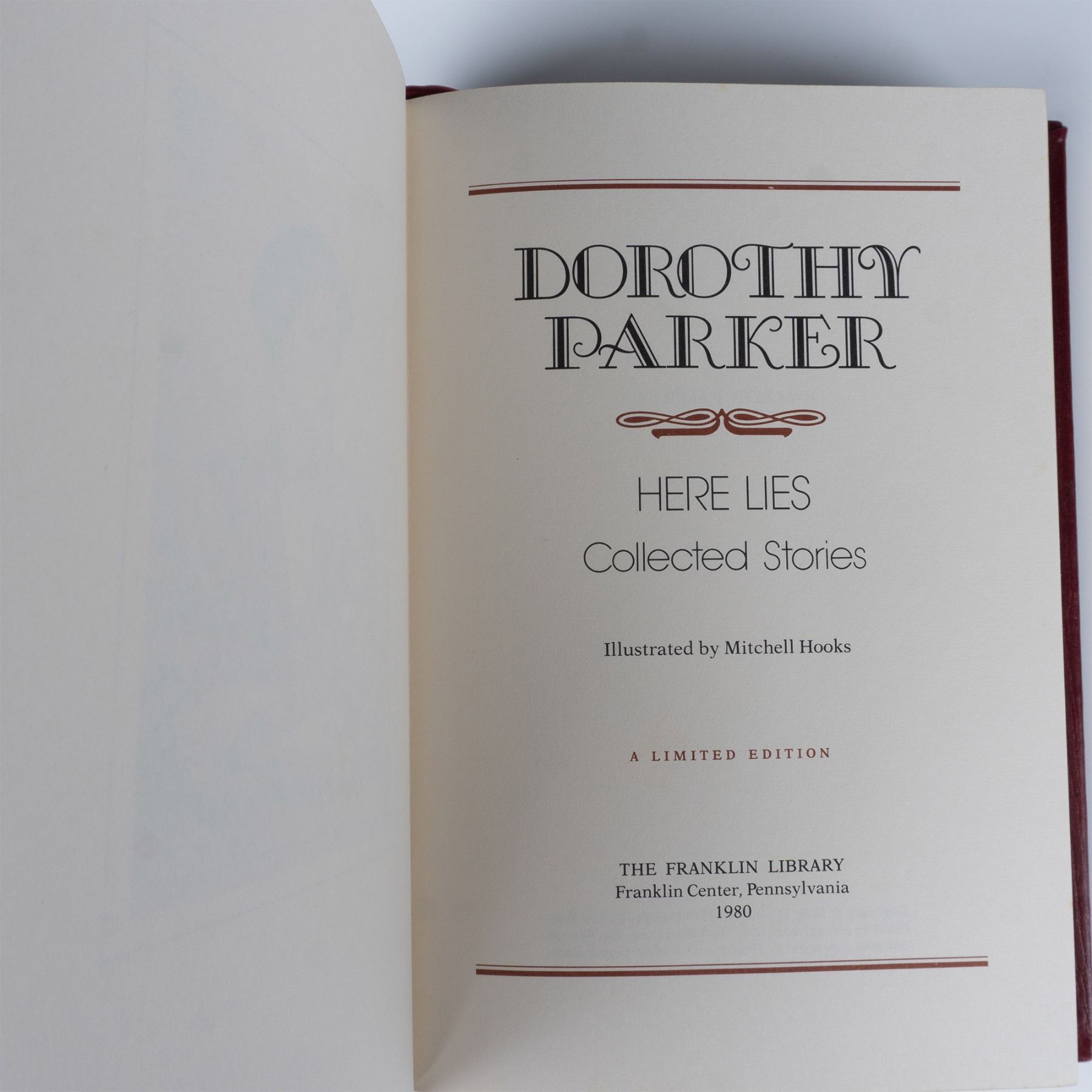 The Franklin Library limited edition book in deep red biding, raised spine bands, gold gilded page edges, and gilt decoration. Here Lies Collected Stories includes twenty short stories by American poet, and writer of fiction, plays and screenplays Dorothy Parker with illustrations by Mitchell Hooks. Published by The Franklin Library: Franklin Center, Pennsylvania, 1980.