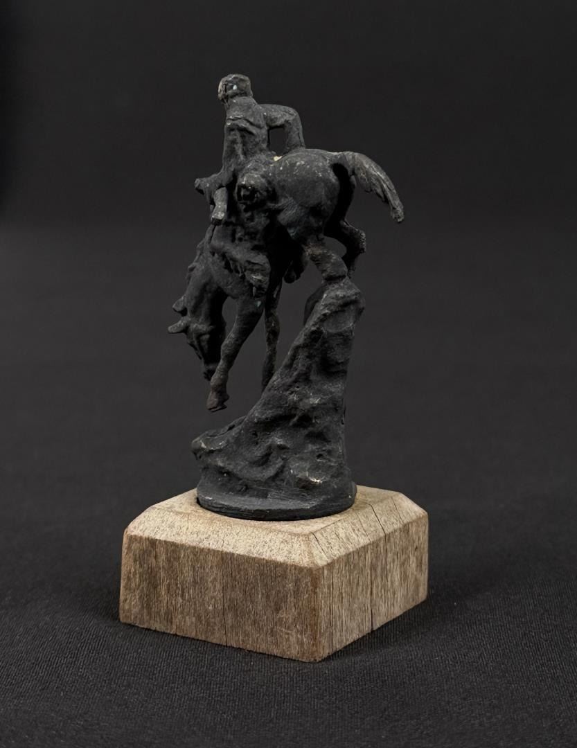 The Mountain Man. 2 7/8" tall, 1 1/4" diameter. Frederic Sackrider Remington (1861 - 1909) was active/lived in New York, Kansas, Connecticut. Frederic Remington is known for Western painting and sculpture, illustration. In his lifetime polymath Frederic Remington was the most successful and famous Western American artist. His immense talents included excelling as an illustrator, author, sculptor, and fine artist. His was a life tragically cut short. Born on October 4, 1861 in Canton, a small berg in bucolic upper state New York, he was much influenced by his father Seth Pierpont Remington, a Republican journalist who founded the St. Lawrence Plaindealer. His father had been a captain in the Civil War, and in 1870 President Ulysses S. Grant appointed him United States Collector of the Port of Ogdensburg, New York. In 1876 young Frederic enrolled at Highland Military Academy in Worcester, Massachusetts where he studied for the next two years. Two years later he enrolled at Yale for one year to study in the School of Fine Arts. His two loves were art and football. Only three months into school, he published his first illustration in the on-campus newspaper Yale Courant. On the gridiron he was a natural, demonstrating great strength and agility. Like Theodore Roosevelt, Remington also enjoyed boxing. A year later he met his future wife Eva Caten from Gloversville, New York. After the death of Remington’s father from tuberculosis on February 18, 1879, Eva rejected his first marriage proposal. Floundering, Remington headed to the American West to find himself—much like Theodore Roosevelt did when his mother and wife died on the same day. That led to a trip to Montana where he completed a number of sketches. Invigorated by his Western experiences, in February 1883 he headed to Kansas and with part of his inheritance bought a 160 acre sheep ranch near Peabody, Kansas. That failed adventure lasted about a year, and he then relocated to Kansas City, Missouri where Eva would join him as his wife. Yet he squandered the rest of his inheritance on a saloon there. After more illustrations were sold to Harper’s Weekly, in 1885 the Remingtons moved to New York City, and in 1886 he attended the Art Students League. By then Remington was earning $1,200 a year, twice the income of a school teacher. Other magazines such as St. Nicholas and Outing also published his art. His work certainly impressed a young Theodore Roosevelt who was chronicling his life in Medora—now in North Dakota—for a serial that ran in The Century Magazine. It was very common at the time for authors to serialize their works in magazines before they were published in book form. In the fall of 1887 Remington was commissioned to illustrate the magazine stories which ended up in Roosevelt’s 1888 classic book Ranch Life and the Hunting Trail. Early on, a lasting friendship between the two was cemented through these publications. By 1889 he had garnered national notoriety as one of the most accomplished illustrators in the country. He was a national celebrity. In 1889 his monumental canvas A Dash for the Timber was exhibited at the National Academy of Design. The New York Times reported, "The picture at the Autumn exhibition of the Academy of Design before which stands the largest number of people is Frederic Remington’s Dash for the Timber." A Silver medal for Last Lull in the Fight followed at the Exposition Universelle in Paris. In 1891 the National Academy of Design elected Remington as an Associate member. Yet he was never admitted as National Academician, despite support from fellow artists Gilbert Gaul, Childe Hassam, and others. His financial success allowed the Remingtons to move into a grand home he named Ednion Algonquin for "a place where I live in New Rochelle, New York. A young Norman Rockwell would someday paint in his studio. Through his travels, Remington embraced social Darwinism survival of the fittest that championed the U.S. military’s domination of the inferior Native Americans. Theodore Roosevelt, George Armstrong Custer, and Remington along with most other Americans—idolized Charles Darwin. As early as 1888 Remington started contributing short stories along with illustrations to magazines. His writings teemed with romantic Western stories chalk full of drama and violence. Initially, they presented the cavalryman as the hero and the Indian as the villain, especially when the Indian had been tainted with the vices of the white man. His West was the "frontier model where the fittest were rugged individuals from northern Europe and white Americans. Even though he was an accomplished author and painter, perhaps his greatest talent was as a sculptor. His bronzes are more famous and collectible than any other Western American artist. And yet his bronze repertoire was completed in just fourteen years. Starting in order of modeling, they are: The Broncho Buster, The Wounded Bunkie, The Wicked Pony, The Scalp, The Norther, The Cheyenne, The Buffalo Signal, Coming Through the Rye, The Mountain Man, The Sergeant, Paleolithic Man, Savage, Polo, The Rattlesnake, Dragoons 1850, The Outlaw, The Horse Thief, The Buffalo Horse, The Cowboy, Trooper of the Plains 1868, The Broncho Buster (large), and The Stampede. His Coming Through the Rye was widely viewed by the public at two world’s fairs. A New Jersey artisan in 1904 was commissioned by Remington to produce a heroic size plaster of the sculpture for the 1904 Louisiana Purchase Exposition in St. Louis, Missouri (called Off the Trail). It was then shipped to Portland, Oregon the next year for the Lewis and Clark Exposition and titled Shooting Up the Town. The Cowboy—his only monumental bronze—was commissioned in 1905 by the Fairmount Park Art Association in Philadelphia. The twelve feet high bronze was shipped to Philadelphia in May 1908 and unveiled in the park as The Mounted Cowboy. In 1900 Remington turned to Riccardo Bertelli at Roman Bronze Works in Brookly