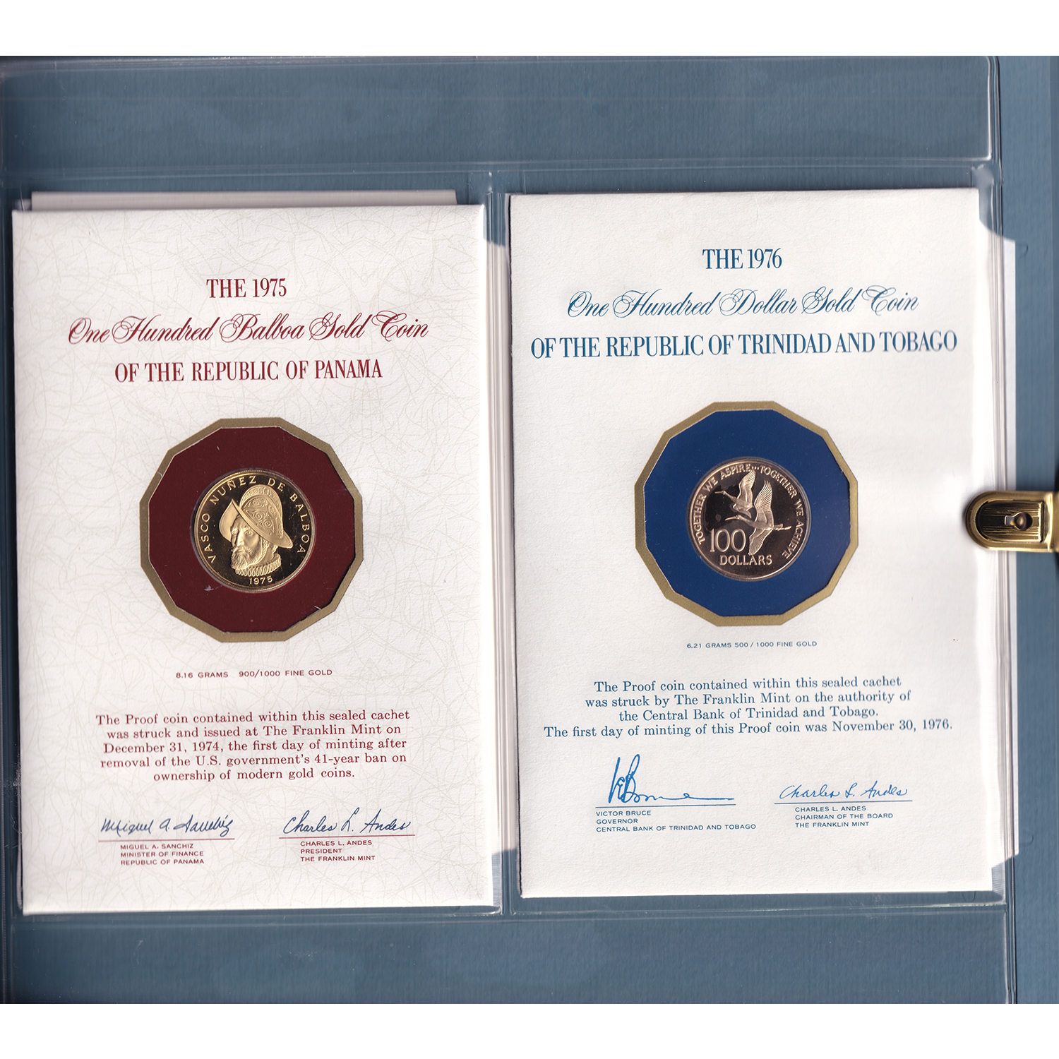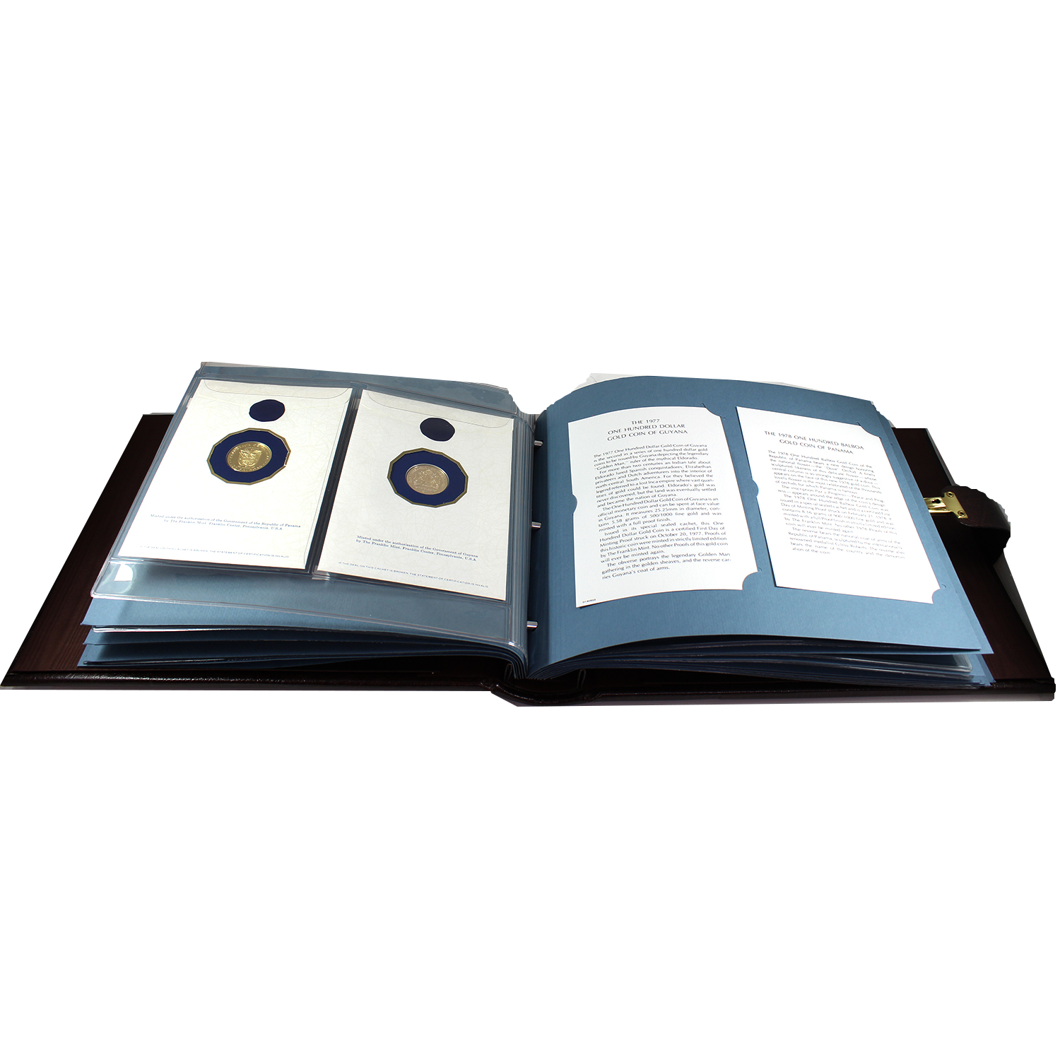 This binder contains coins from the Franklin Mint Gold Coin Club from 1975-1980. Only half of the binder is full. The key for the binder is at the back of the book in a plastic pouch, hooked onto the middle ring.