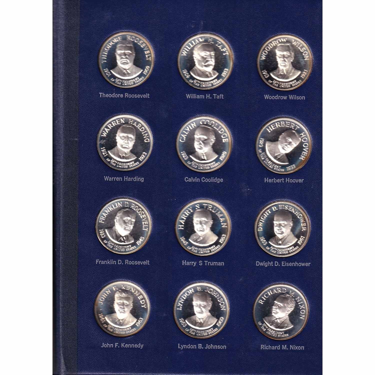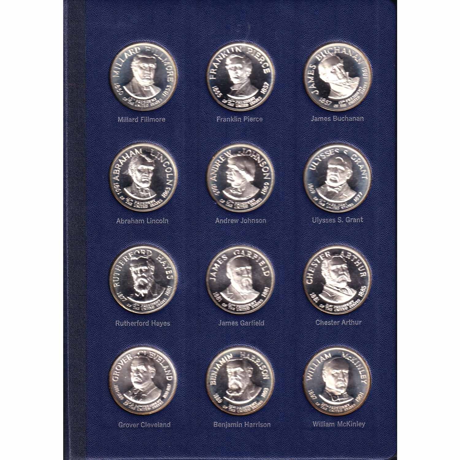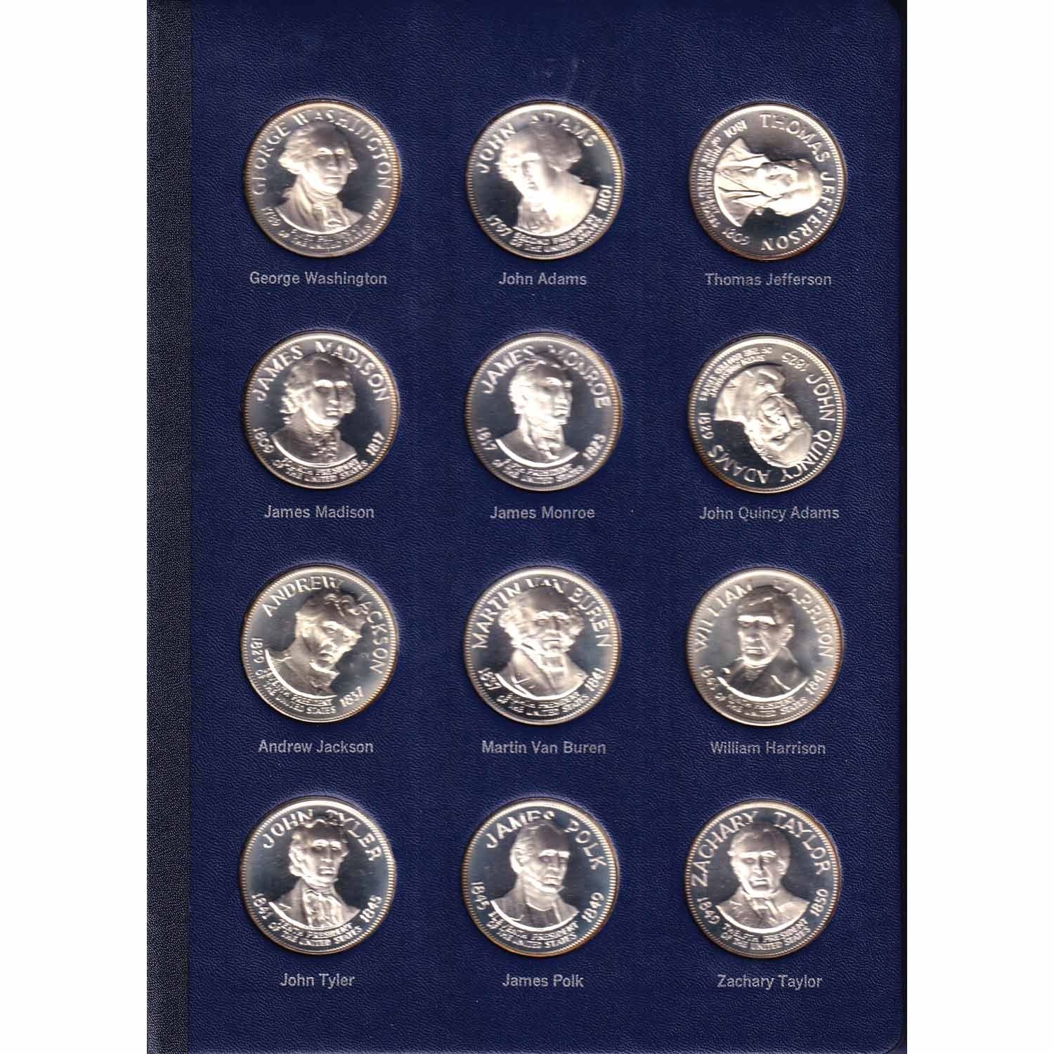 The Franklin Mint Treasury of Presidential Commemorative Medals *American Express Edition* 36-medal Sterling Silver Set. Every medal features each President's profile from George Washington to Richard Nixon. Each medal weighs 37.5g with a Pure Silver content of 34.68g. Contains 40.14oz total Pure Silver content (most of the medals are toned)