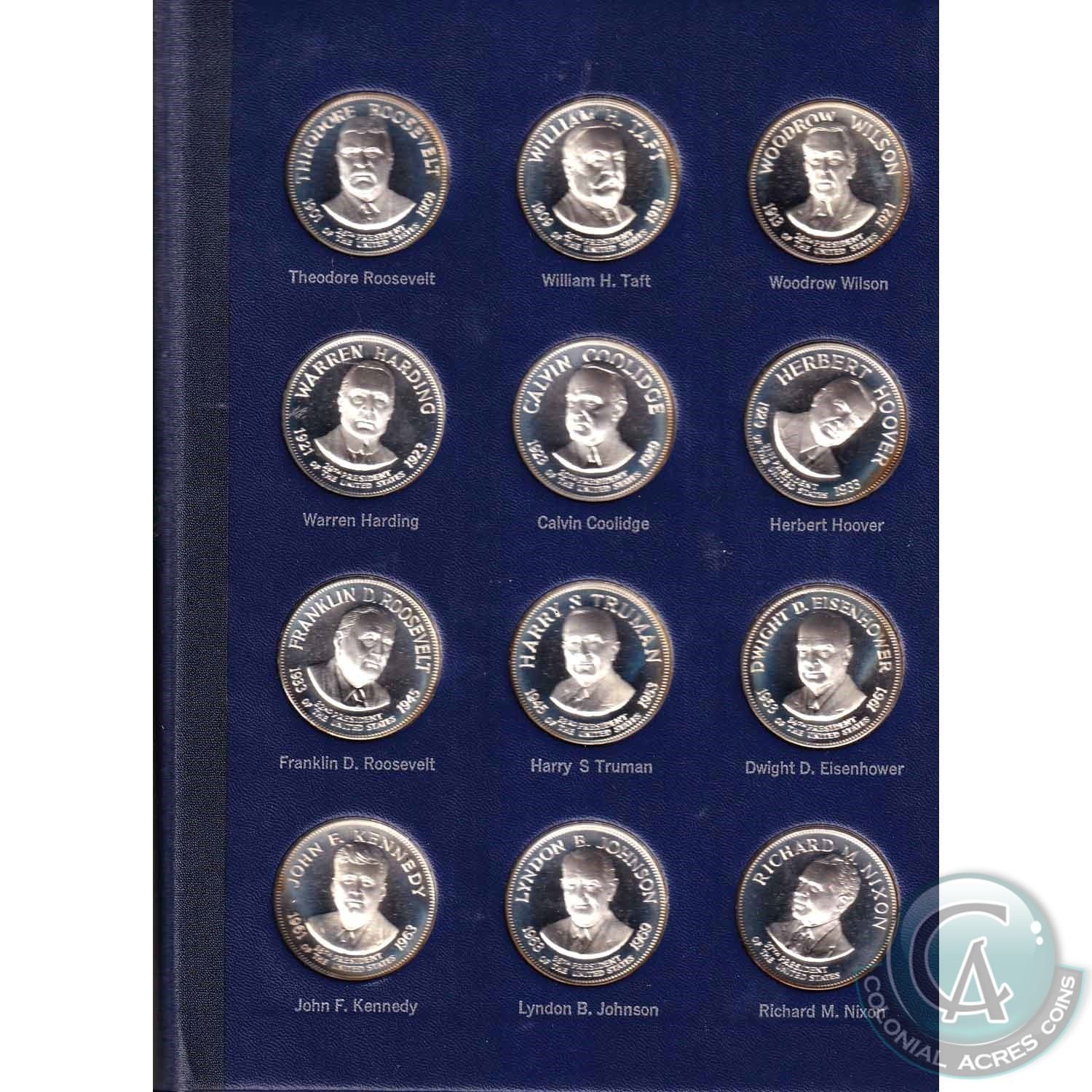 The Franklin Mint Treasury of Presidential Commemorative Medals *American Express Edition* 36-medal Sterling Silver Set. Every medal features each President's profile from George Washington to Richard Nixon. Each medal weighs 37.5g with a pure silver content of 34.68g. Contains 40.14oz total pure silver content. (Most of the medals are toned)