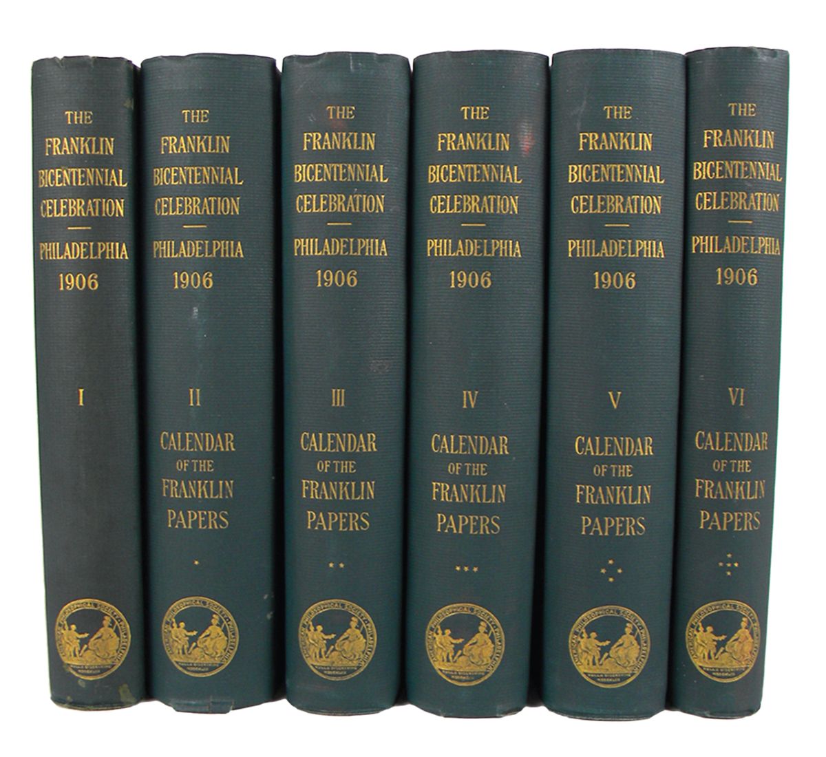 American Philosophical Society. THE RECORD OF THE CELEBRATION OF THE TWO HUNDREDTH ANNIVERSARY OF THE BIRTH OF BENJAMIN FRANKLIN, UNDER THE AUSPICES OF THE AMERICAN PHILOSOPHICAL SOCIETY HELD AT PHILADELPHIA FOR PROMOTING USEFUL KNOWLEDGE, APRIL THE SEVENTEENTH TO APRIL THE TWENTIETH, A.D. NINETEEN HUNDRED AND SIX. Philadelphia, 1906-08. Six volumes, complete. 8vo, original matching green cloth, gilt. Color frontispieces to two volumes; xix, (1), 321, (1); xx, 573, (3); ix, (1), 526, (2); ix, (1), 560; ix, (1), 510, (2); ix, (1), 325, (1) pages; 3 additional plates with tissue guards. Some hinges repaired with tape or cracked. Largely unopened. Generally near fine. An important compendium of Franklin letters and other material. Beginning with the second volume, the series comprises the Calendar of the Papers of Benjamin Franklin in the Library of the American Philosophical Society, and constitutes a major resource for any research on Franklin. Volumes II and III print letters to Franklin housed in the APS library, while Volumes IV and V include letters to and from Franklin and general papers; Volume VI constitutes a thorough index. Illustrations include the St. Gaudens Franklin medal and a fine photogravure of the Wedgwood cameo medallion of Franklin. Ex James Strohn Copley, with his bookplate.