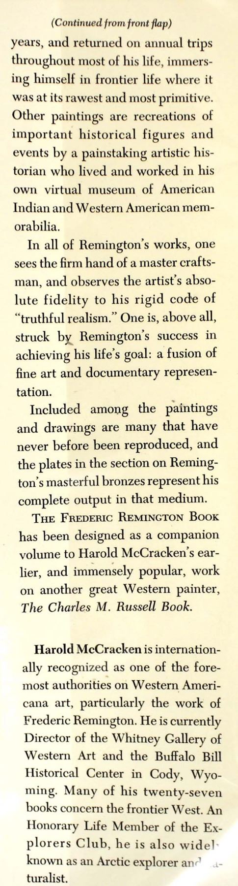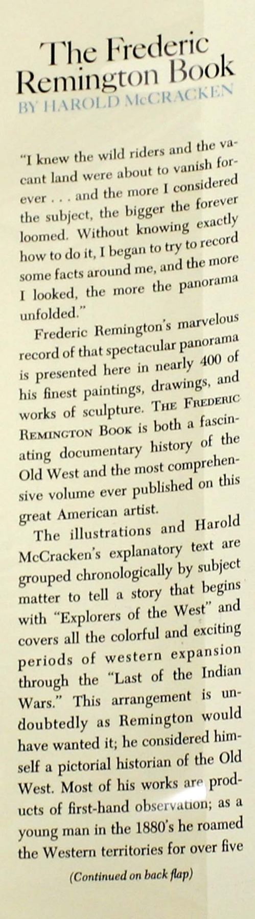 The Frederic Remington Book by Harold McCracken, hardback book c. 1966 Doubleday & Company, Inc. Garden City, N.Y., ''FIRST EDITION, After Limited Edition of 500 copies'', comes in original book jacket, like new condition, does have a book plate inside of cover which reads ''Ex Libris Harold Windscheffel''