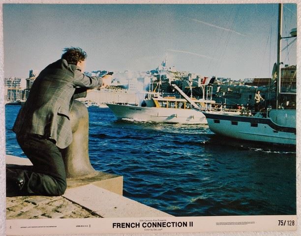 The French Connection II (20th Century Fox) lobby card. Action, Drama, Thriller. Starring Gene Hackman, Fernando Rey, Bernard Fresson, Jean-Pierre Castaldi, Charles Millot, Cathleen Nesbitt, Ed Lauter, Philippe Léotard. Directed by John Frankenheimer. Very light edge wear, some creases. Excellent. (11"x14").