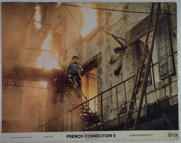 The French Connection II (20th Century Fox) lobby card. Action, Drama, Thriller. Starring Gene Hackman, Fernando Rey, Bernard Fresson, Jean-Pierre Castaldi, Charles Millot, Cathleen Nesbitt, Ed Lauter, Philippe Léotard. Directed by John Frankenheimer. Very light edge wear, some creases. Excellent. (11"x14").