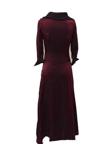The French Dispatch (2021) - Lucinda (Frances McDormand) custom made, test dress. Dark red, shimmery fabric with sewn on black cuffs and collar. Inside the collar reads: "McDormand".