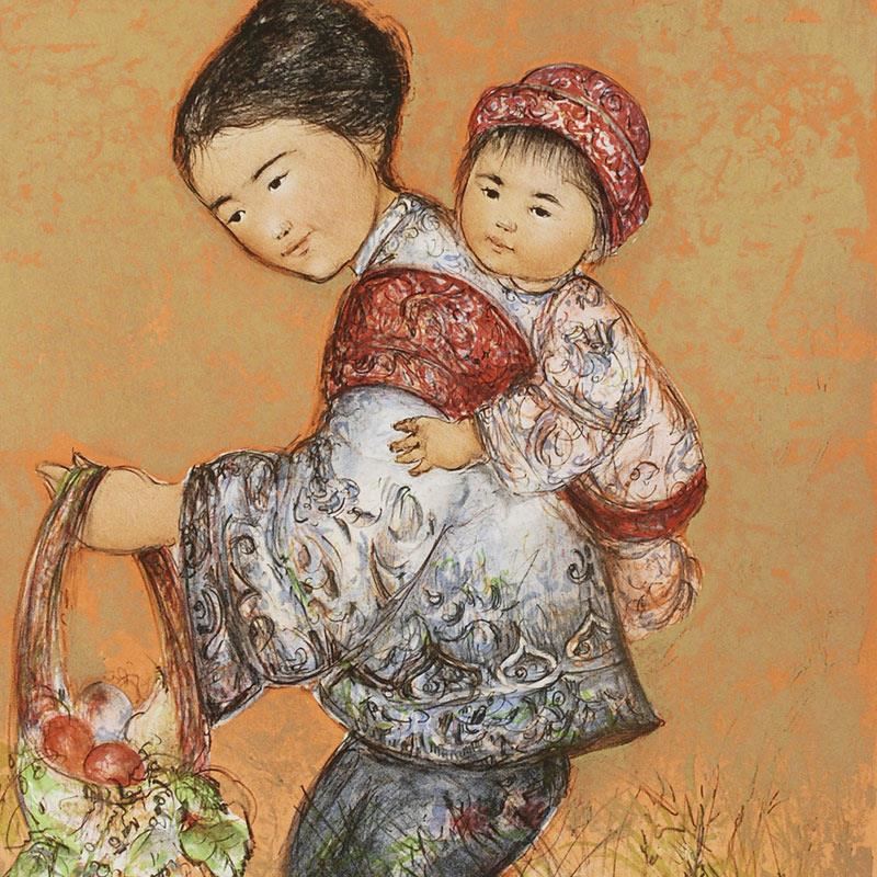 "The Fruit Seller" is a limited edition lithograph on paper, numbered and hand signed by Edna Hibel (1917-2014). Includes Certificate of Authenticity! Measures approx. 18.5" x 23" (with border), 14" x 18" (image).