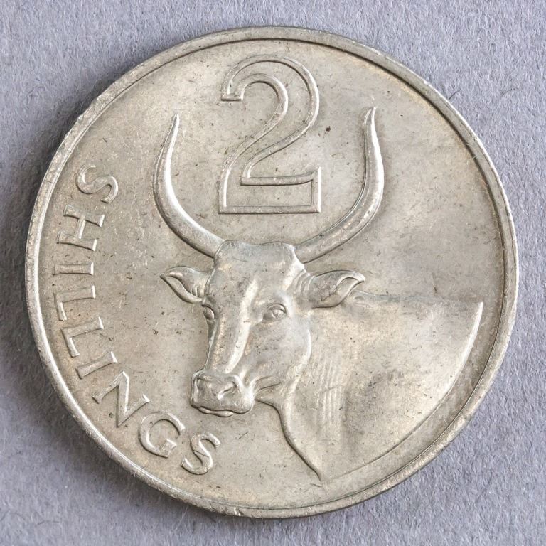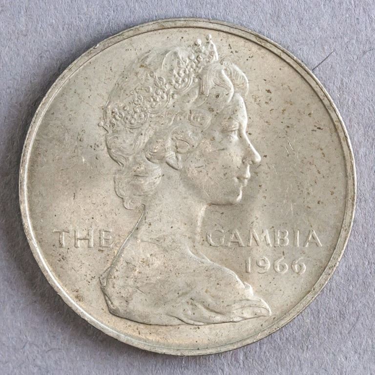 The Gambia coin. Obverse: Young bust right. Lettering: THE GAMBIA 1966. Reverse: African domestic ox divides denomination. Lettering: 2 SHILLINGS.