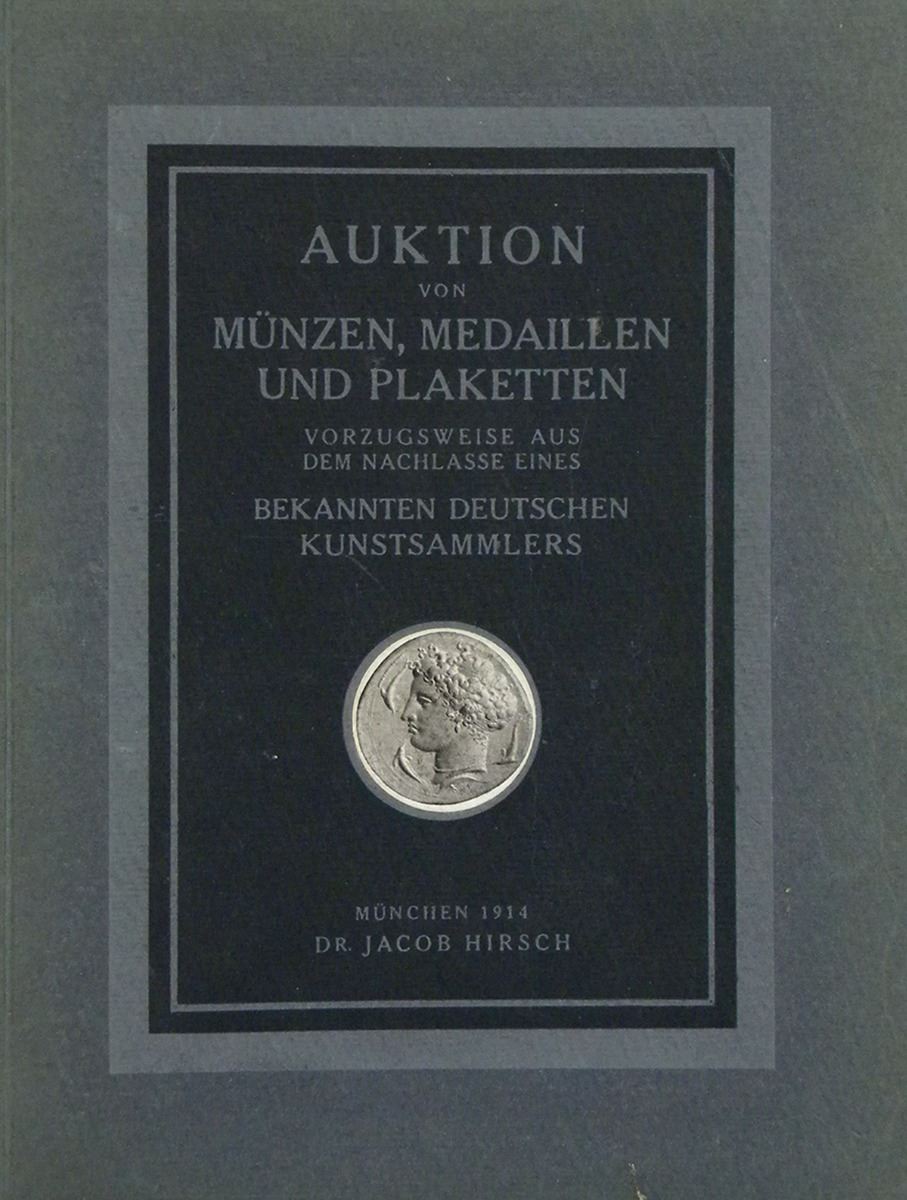 Hirsch, Jacob. GRIECHISCHE, RÖMISCHE, BYZANTINISCHE MÜNZEN. MEDAILLEN UND PLAKETTEN DER RENAISSANCE. ... München: No. XXXIV., 5. Mai 1914 und ff. Tage. 4to, original printed card covers with mounted illustration. (4), 147, (5) pages; 2264 lots; 60 fine plates of coins. Fine. Clain-Stefanelli 3666. Grierson 280. Spring 388, attributing ownership to Garrucci [also listed under "Most important sales of ancient Greek coins," "Most important sales of aes grave" and "Most important sales of Roman Imperial coins"]. Ex Domenico Rossi, with his bookplate.