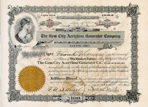 1907, Ohio. Stock certificate for 5 shares. Black with gold overlay and gold seal. Uncancelled. Very fine.