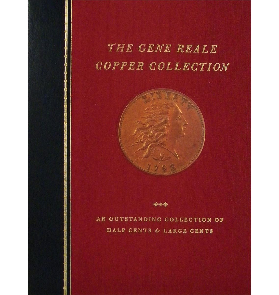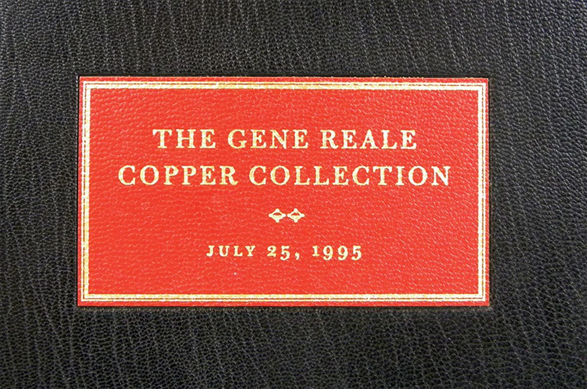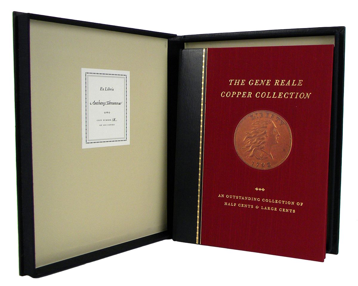 (Reale, Gene). THE GENE REALE COPPER COLLECTION. A COLLECTION OF HALF CENTS AND LARGE CENTS IN SUPERB UNCIRCULATED CONDITION. Lunenburg: Stinehower Press, 1995. 4to, well-bound in original black quarter morocco, decoratively ruled in gilt, with crimson grained fine cloth sides; upper cover lettered and decorated in gilt with an inset full color coin enlargement in the center; flat spine lettered and decorated in gilt; crimson silk headbands; decoratively printed pictorial endpapers. Housed in a handsomely executed black full morocco clamshell book box; red morocco panel inset on the upper cover, double bordered and lettered in gilt; spine with five raised bands, lettered in gilt. Blank leaf, 110 pages; title printed in two colors within a decorative border; color portrait; enlarged coin illustrations in full color throughout. Fine. Ex Anthony Terranova, Copy No. 15 of 100, according to the printed label on the inside front cover of the clamshell box, though fewer copies were probably issued. A marvelous production, recording 141 superb half cents and large cents in the Reale collection. Copies of this work were advertised for sale upon publication for $2150.00.
