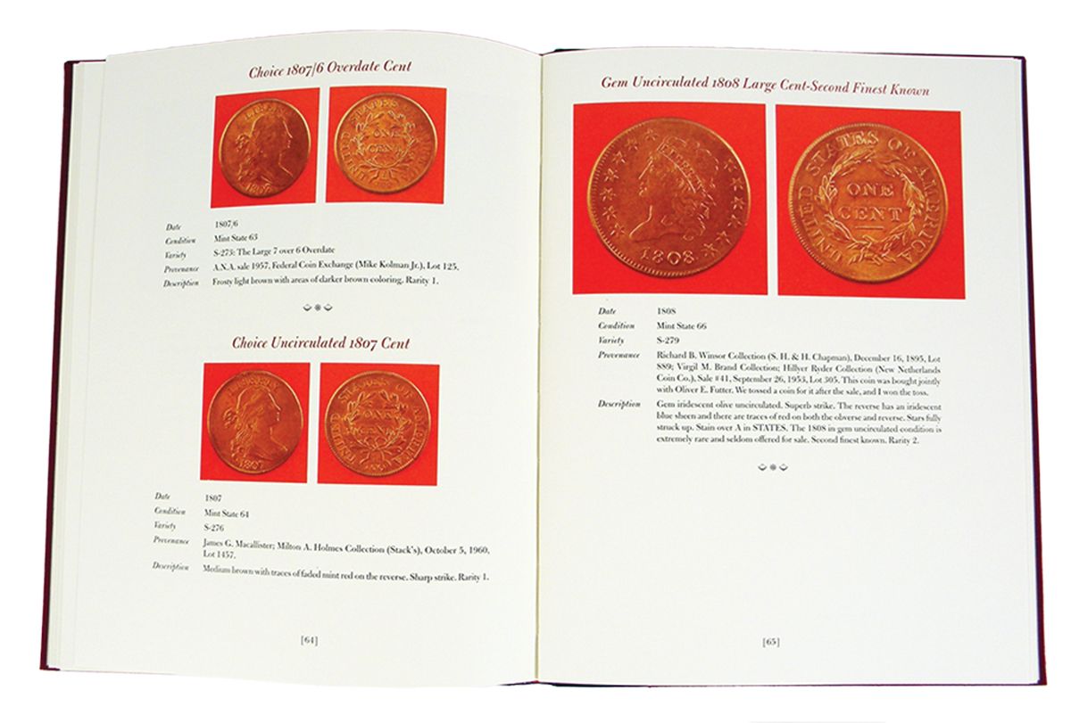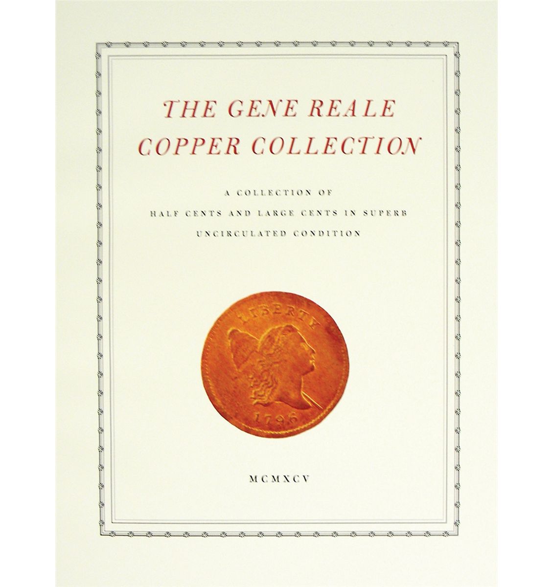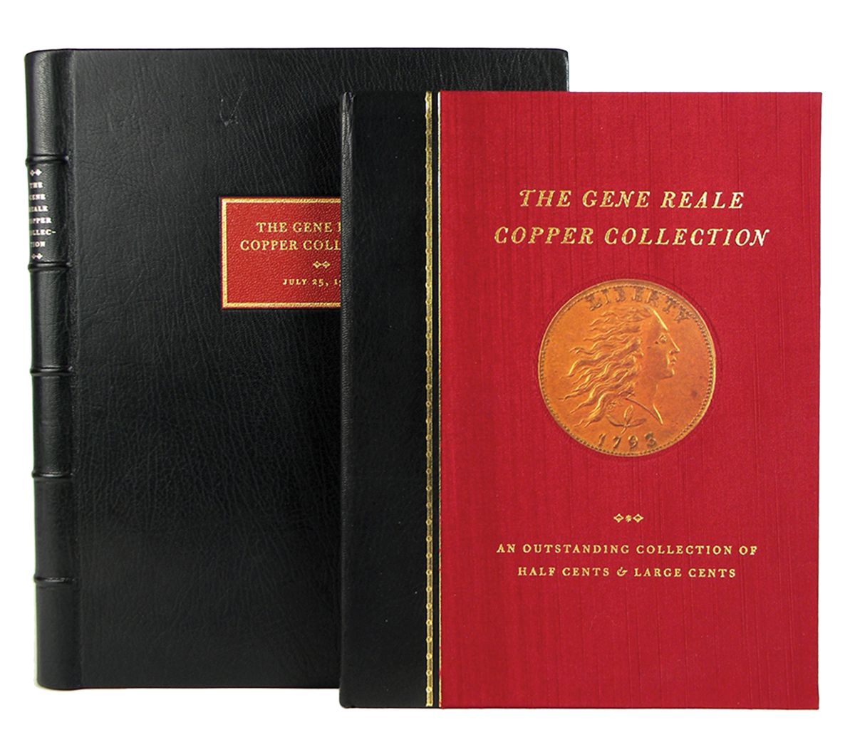 (Reale, Gene). THE GENE REALE COPPER COLLECTION. A COLLECTION OF HALF CENTS AND LARGE CENTS IN SUPERB UNCIRCULATED CONDITION. Lunenburg: Stinehower Press, 1995. 4to, well-bound in original black quarter morocco, decoratively ruled in gilt, with crimson grained fine cloth sides; upper cover lettered and decorated in gilt with an inset full color coin enlargement in the center; flat spine lettered and decorated in gilt; crimson silk headbands; decoratively printed pictorial endpapers. Housed in a handsomely executed black full morocco clamshell book box; red morocco panel inset on the upper cover, double bordered and lettered in gilt; spine with five raised bands, lettered in gilt. Blank leaf, 110 pages; title printed in two colors within a decorative border; color portrait; enlarged coin illustrations in full color throughout. A few scuffs to the clamshell box, else fine. Ex Robert Yuell, inscribed to him ("a reasonably famous New Jersey collector") by the author. An unnumbered copy of this marvelous production, recording 141 superb half cents and large cents in the Reale collection. Copies of this work were advertised for sale upon publication for $2150.00. Ex Michael Spurlock library.