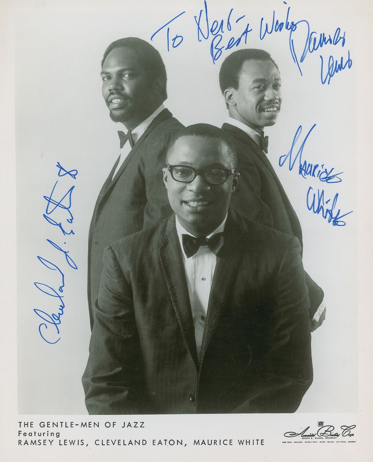 Glossy 8 x 10 publicity photo of the Gentle-Men of Jazz, signed and inscribed in blue felt tip, "To Herb—Best wishes, Ramsey Lewis," "Maurice White," and "Cleveland J. Eaton, Jr.” In fine condition.