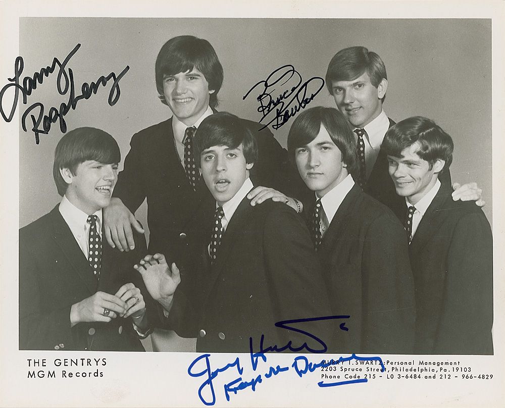 Glossy 10 x 8 group photo, signed in blue and black felt tip by Larry Rasberry, Bruce Bowles, and Jimmy Hart, who adds “Keep On Dancing.” A central horizontal crease, otherwise fine condition.