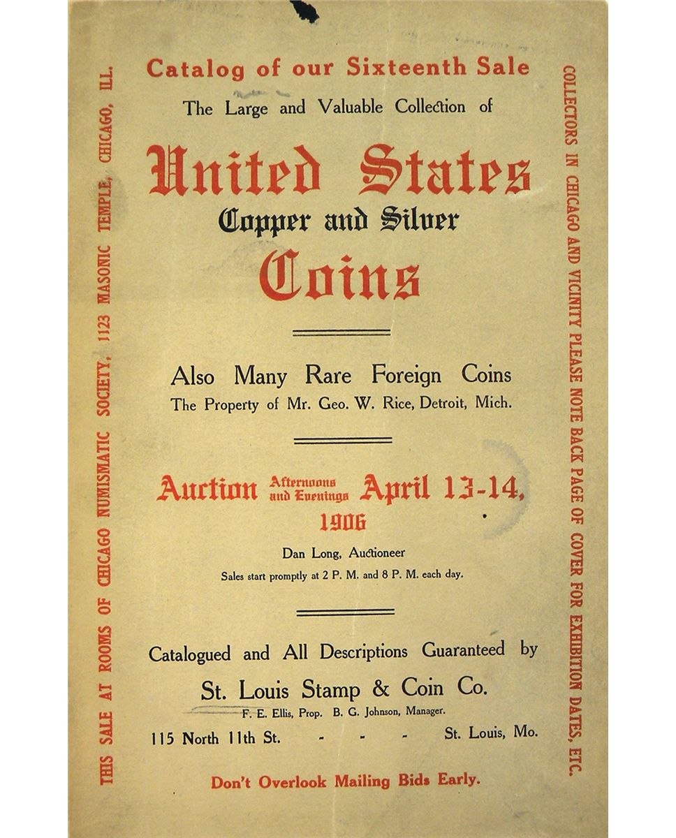 St. Louis Stamp & Coin Co. THE LARGE AND VALUABLE COLLECTION OF UNITED STATES COPPER AND SILVER COINS, ALSO MANY RARE FOREIGN COINS, THE PROPERTY OF MR. GEO. W. RICE, DETROIT, MICH. St. Louis: F.E. Ellis, Prop., B.G. Johnson, Manager, Dan Long, Auctioneer, April 13-14, 1906. 8vo, original printed card covers. 107, (1) pages; 2316 lots; 4 halftone plates of coins. Spine worn; very good. Adams B+. The sale featured Rice's choice collection of large cents, formed over four decades. Nearly 300 lots of cents were offered, including eight 1793s, a very fine 1799 and an "Unc." 1804. His half cents included nearly twenty proofs from 1831 to 1856. Adams also notes "Excellent Jackson tokens," mint state 1796 & 1797 half dollars, etc. Two of the plates depict copper. Despite Johnson's efforts, the sale was apparently not a success. Important and very scarce.