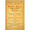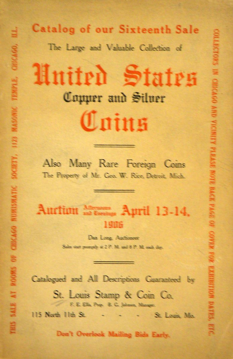 St. Louis Stamp & Coin Co. THE LARGE AND VALUABLE COLLECTION OF UNITED STATES COPPER AND SILVER COINS, ALSO MANY RARE FOREIGN COINS, THE PROPERTY OF MR. GEO. W. RICE, DETROIT, MICH. St. Louis: F.E. Ellis, Prop., B.G. Johnson, Manager, Dan Long, Auctioneer, April 13-14, 1906. 8vo, original printed card covers. 107, (1) pages; 2316 lots; 4 halftone plates of coins. Spine a little worn; very good or better. Adams B+. The sale featured Rice’s choice collection of large cents, formed over four decades. Nearly 300 lots of cents were offered, including eight 1793s, a very fine 1799 and an “Unc.” 1804. His half cents included nearly twenty proofs from 1831 to 1856. Adams also notes “Excellent Jackson tokens,” mint state 1796 & 1797 half dollars, etc. Two of the plates depict copper. Despite Johnson’s efforts, the sale was apparently not a success. Important and rather scarce.