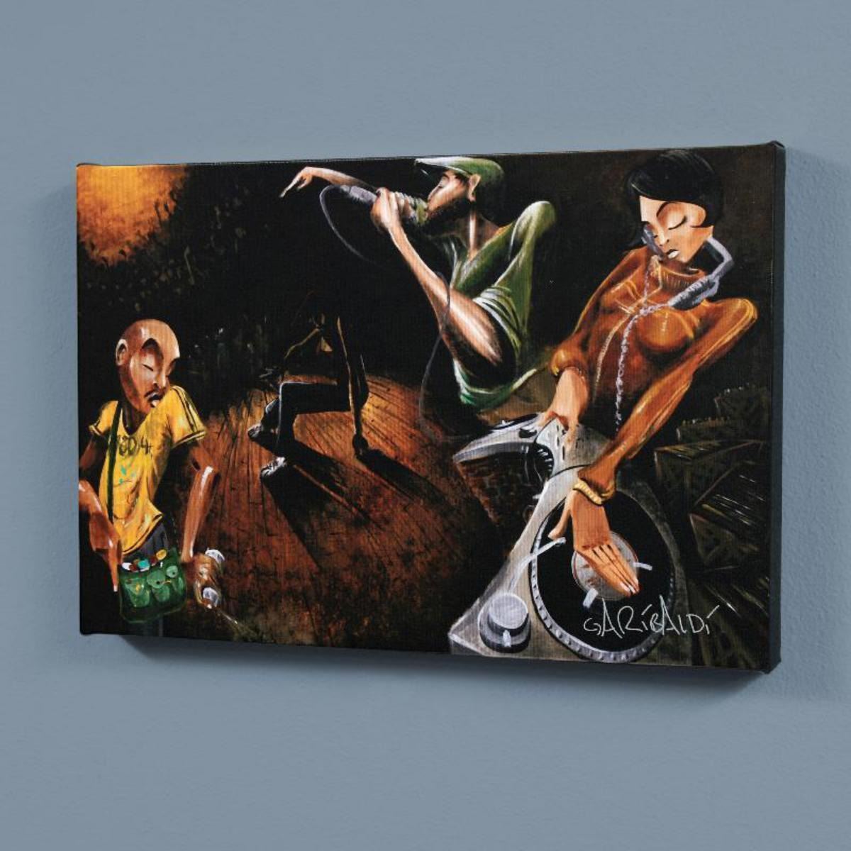 Combining his passions for music and art, David Garibaldi creates visual poetry. "The Get Down" is a limited edition giclee on stretched canvas, M numbered and bearing the artist's authorized signature. This piece comes gallery wrapped. Includes Certificate of Authenticity! Measures approx. 60" x 40" (image). Reference #: 178438.