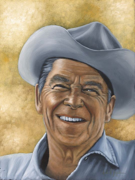 The Gipper by Michael Joseph : This is an original 24”x18” acrylic painting on canvas, by the late great Sports & Celebrity artist Michael Joseph. An admirer of the 40th President, Michael Joseph created his painting from a photograph at the Reagan Library in Simi Valley California. It is beautifully framed in rustic colors befitting the Reagan we knew at his El Cielo ranch & western White House ,near Santa Barbara.