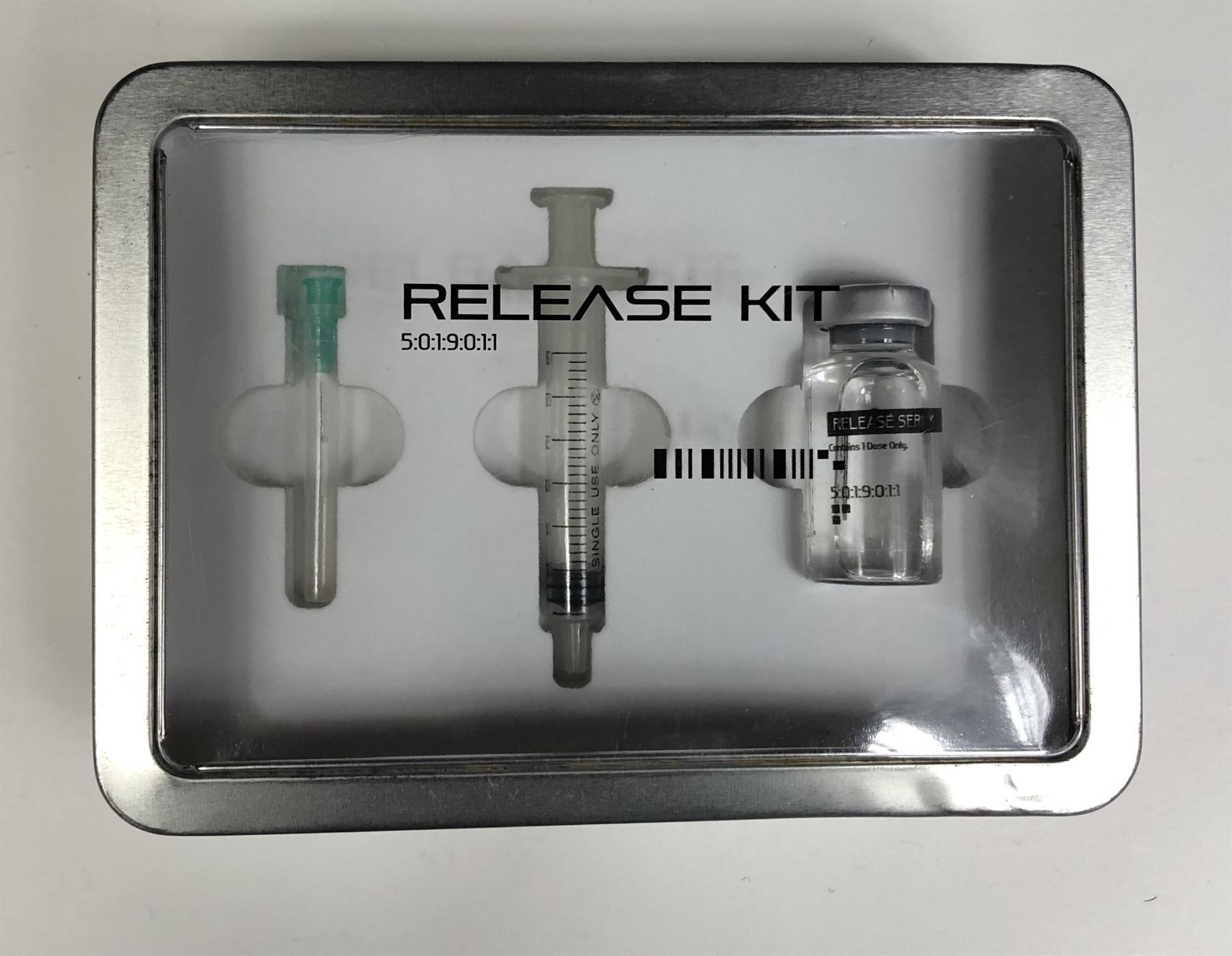 Original hero release kit box with syringe, syringe needle, and bottle used in the production of the social science fiction dystopian film 'The Giver' (2014), where, in a seemingly perfect community, without war, pain, suffering, differences or choice, a young boy is chosen to learn from an elderly man about the true pain and pleasure of the "real" world.