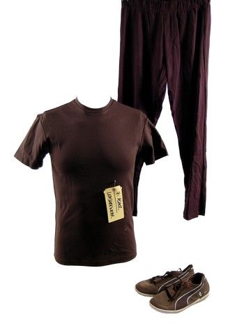 The Giver - Asher (Cameron Monaghan) screen worn, hero, brown short sleeve stretch fit leasure wear top, brown pants, and brown lace up the front with velcro 'Puma' shoes. Includes wardrobe tag!