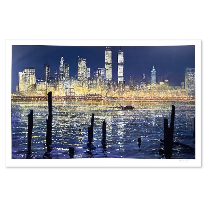 "The Glisten of New York" is a limited edition lithograph on paper by Peter Ellenshaw (1913-2007), numbered and hand signed by the artist. Includes Letter of Authenticity. Measures approx. 36" x 24.5" (border), 31" x 19" (image). Please note: there may be minor creases on the paper; specifically, a crescent shaped crease on the top-left part of the image that is only visible from certain angles. **